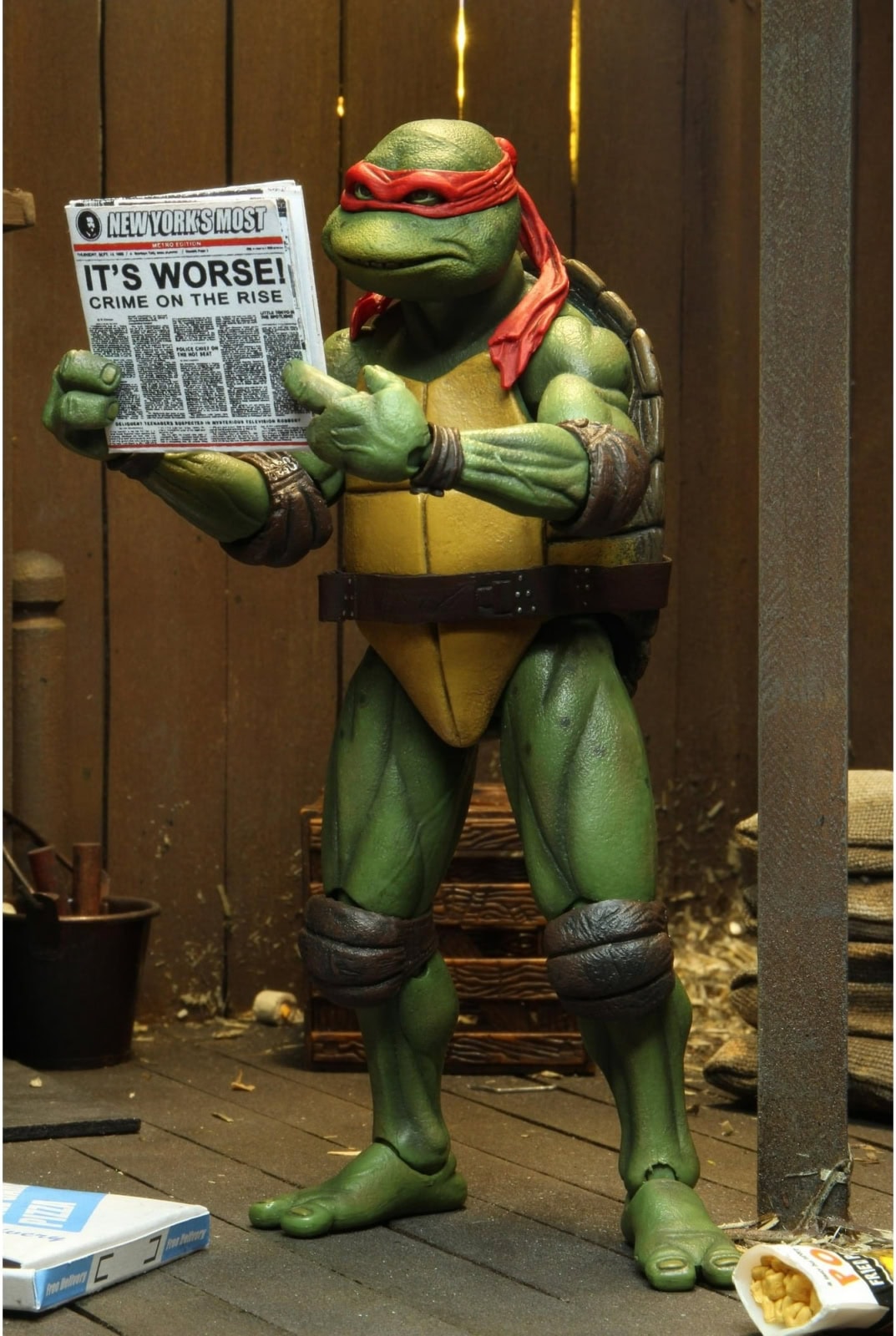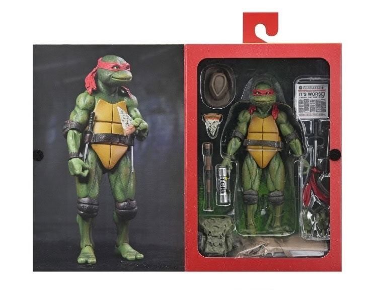 Shell-a-brate the 35th anniversary of the original Teenage Mutant Ninja Turtles movie with NECA! After wading in a puddle of radioactive waste, four radical reptiles are transformed into New York City’s greatest crime-fighting quartet! This special anniversary Ultimate action figure features the original 1990 movie version of Raphael with screen-accurate sculpting and authentic details. Accessories include extra hands, backpack, trench coat, hat, pizza, newspaper, baseball bat, sais, and mutagen canister. This 7-inch scale figure comes in all-new, collector-friendly Ultimate packaging with opening front flap.