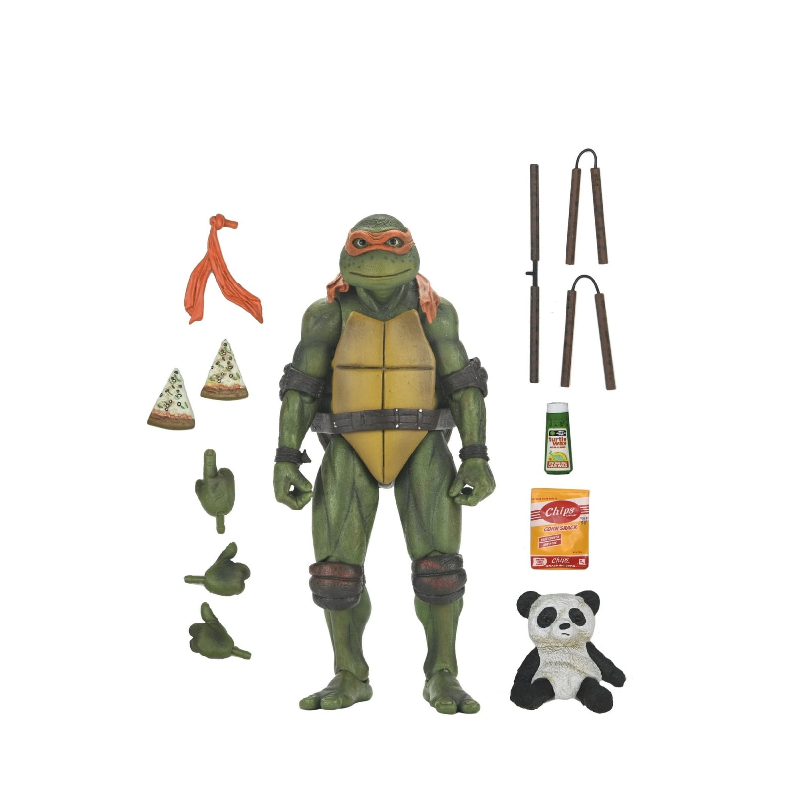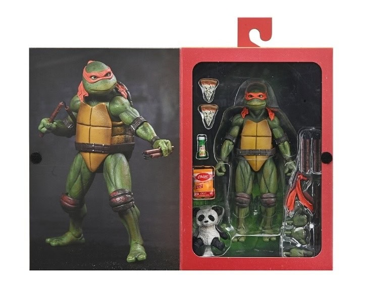 Shell-a-brate the 35th anniversary of the original Teenage Mutant Ninja Turtles movie with NECA! After wading in a puddle of radioactive waste, four radical reptiles are transformed into New York City’s greatest crime-fighting quartet! This special anniversary Ultimate action figure features the original 1990 movie version of Michelangelo with screen-accurate sculpting and authentic details. Accessories include extra hands, pizza slices, panda bear, spinning nunchuck, turtle wax, chips, and nunchucks. This 7-inch scale figure comes in all-new, collector-friendly Ultimate packaging with opening front flap.