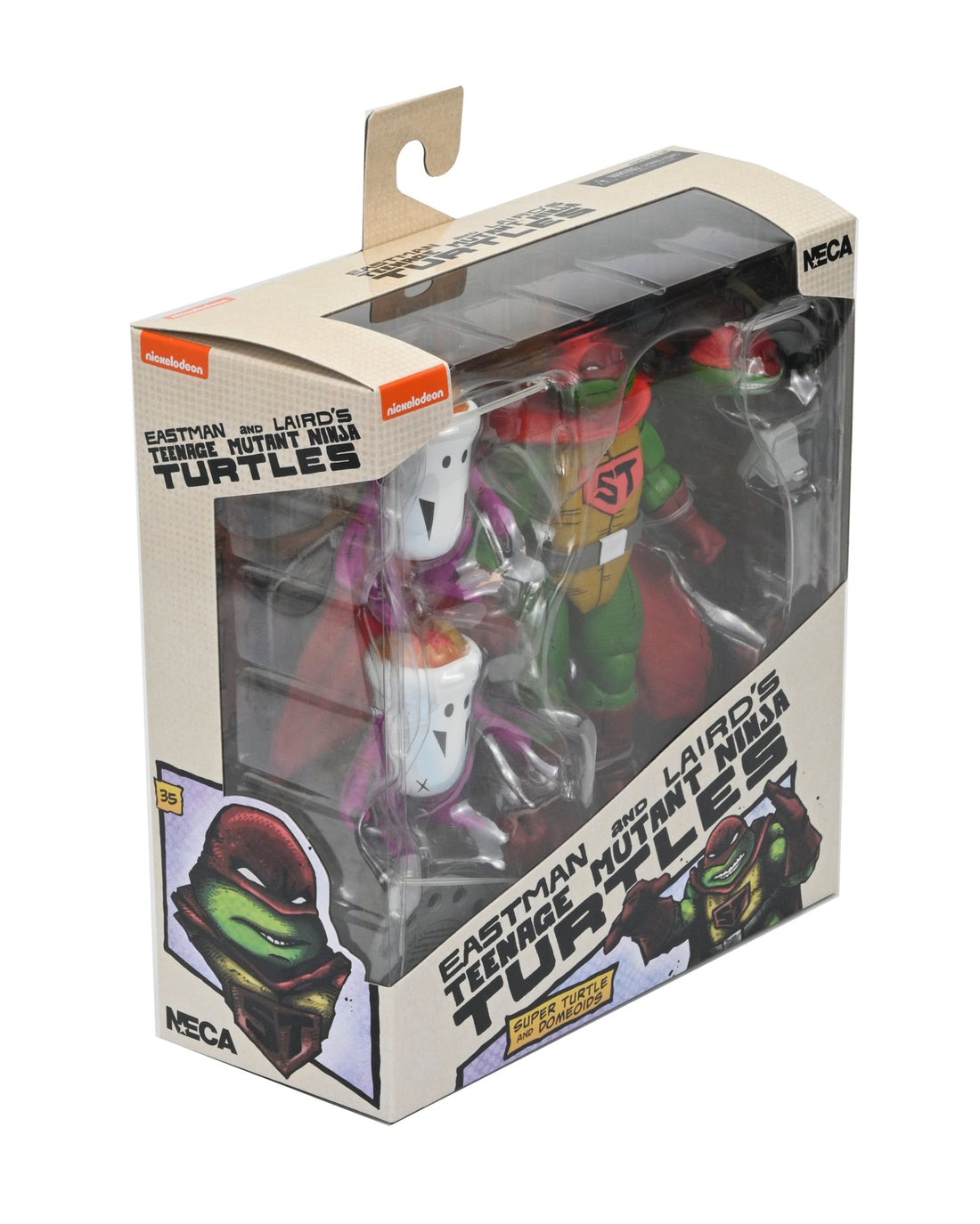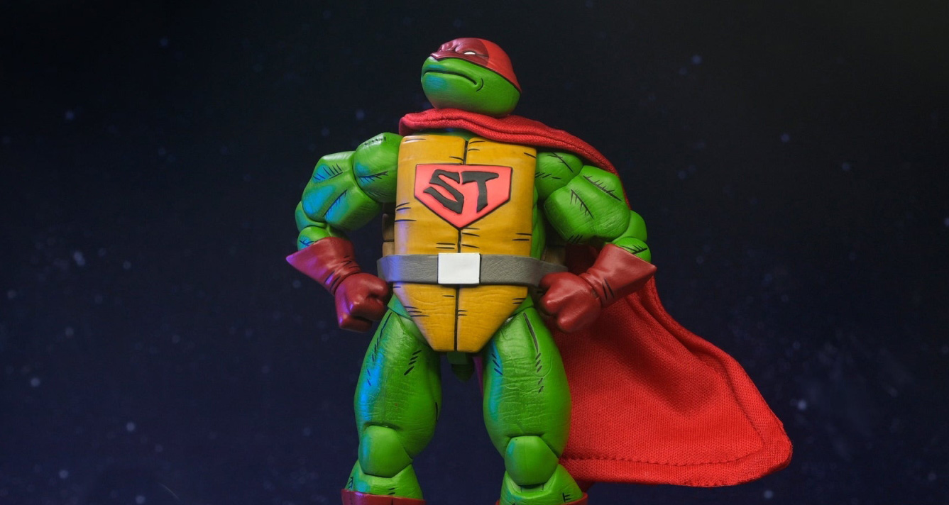 As seen in Tales of the TMNT #5, it’s Super Turtle! This 7-inch scale NECA action figure is here to join your Teenage Mutant Ninja Turtles collection! Complete with soft goods cape, Super Turtle is ready to save the day with multiple heads, hands, and weapons. Plus, he comes with both clean and battle-damaged Domeoid mini figures, as seen in issue #15! Comes in collector-friendly packaging with original artwork by Kevin Eastman.