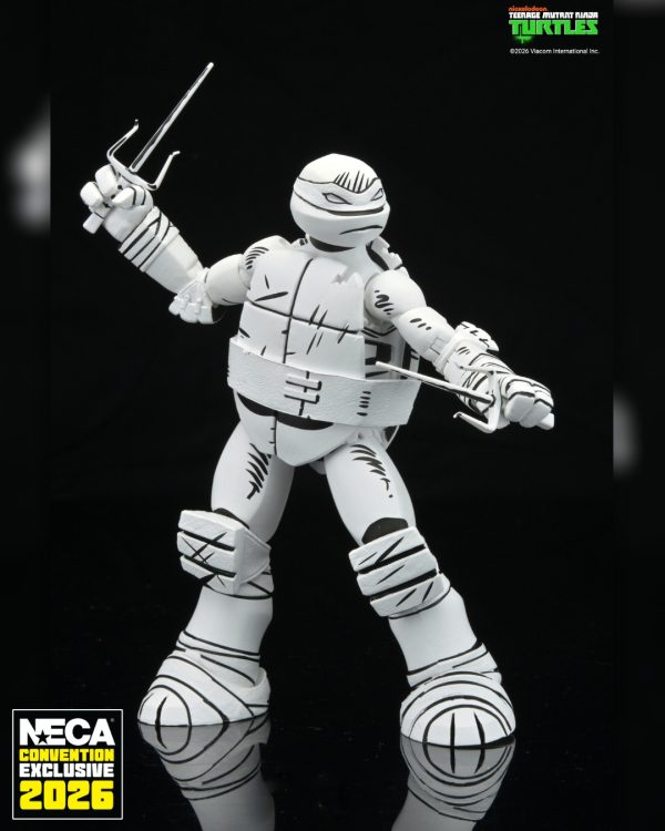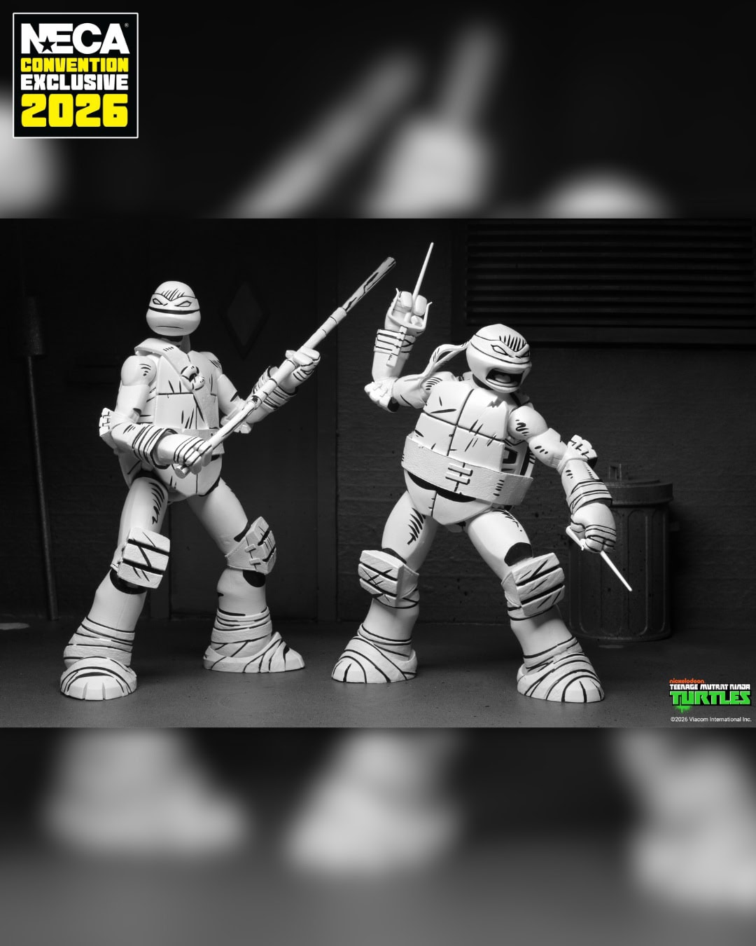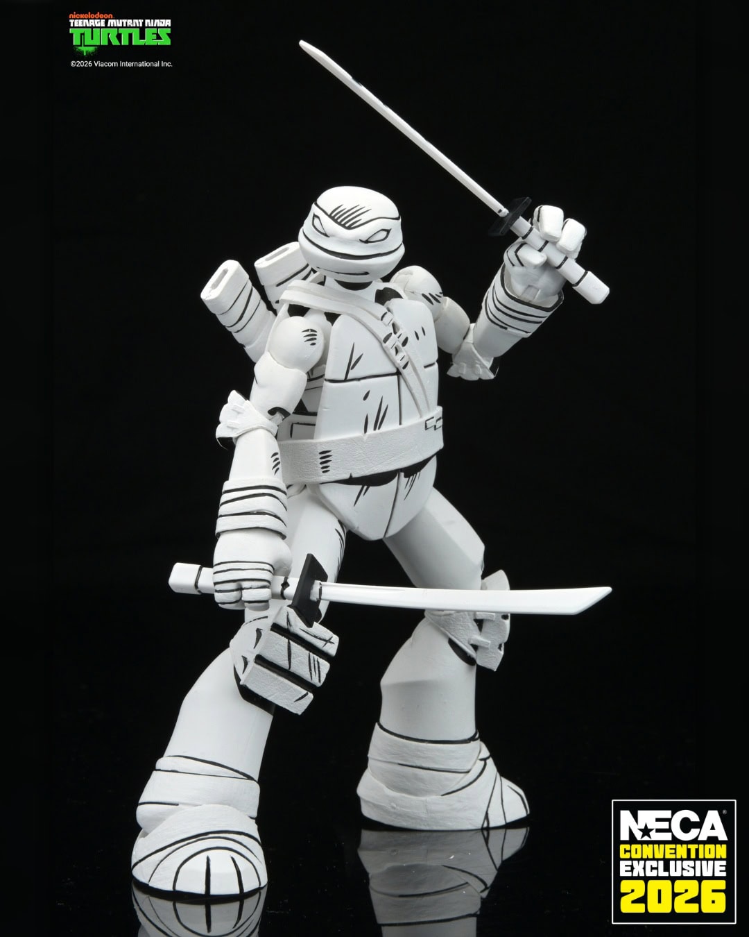 NECA has officially unveiled its 2026 convention exclusive Teenage Mutant Ninja Turtles action figure 4-pack which includes black and white editions of Leonardo, Donatello, Raphael, and Michelangelo, inspired by their appearance in Nickelodeon’s 2012 animated series, along with a selection of interchangeable heads, hands, weapons and accessories. The set is available for a limited pre-order now, priced at $150; take a look here…