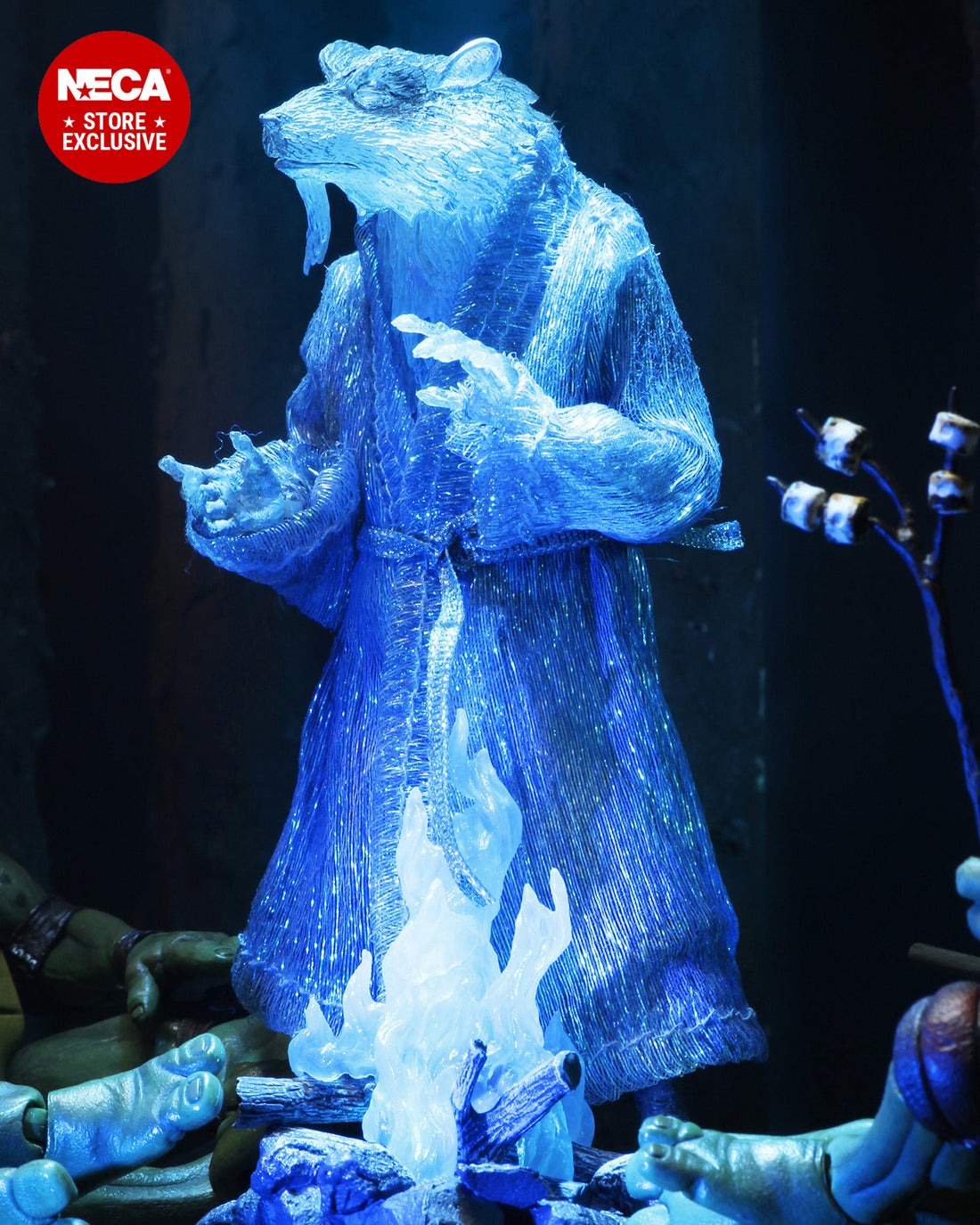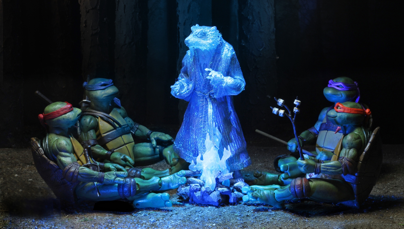 Featuring 30 points of articulation, including double elbows and double knees, Splinter even has a cloth robe that’ll glitter in the moonlight. Set the scene for these epic action figures with three exclusive backdrops from the film. These fully articulated 7-inch scale figures come loaded with accessories, including interchangeable hands, extra mask ties, and weapons. Plus, a spectral campfire with LED, marshmallow skewer, bag of marshmallows, Tile Game Pizza box, and pizza slices! Includes two 1.5-volt LR626 button cell batteries and comes in all-new commemorative VHS style packaging.