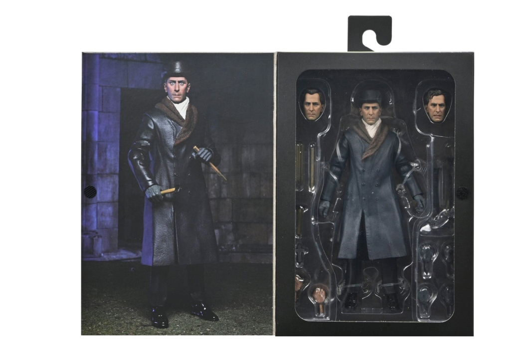 NECA presents the second in a series of action figures from the legendary Hammer House of Horror! Hammer has produced landmark horror since the 1950s, with the first being Horror of Dracula. The film captured audiences with its mix of vivid color, carnality, and violence. Peter Cushing plays the iconic character Van Helsing, who is sent to destroy Dracula, as played by Christopher Lee. This Ultimate Van Helsing stands in 7-inch scale and features an interchangeable waist for an alternate look in either his vest or long coat. Accessories include interchangeable heads, hands, and gloved hands, as well as a cross, hammer, wooden stake, wooden stake bundle, and two candle holders. Comes in collector-friendly window box packaging with opening front flap.