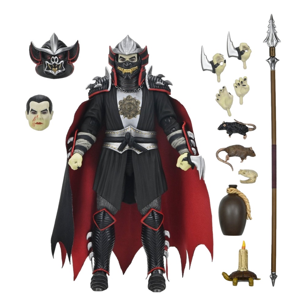 NECA presents the next release in our Universal Monsters x Teenage Mutant Ninja Turtles action figure line, paying tribute to the world’s most famous turtles and Universal’s icons of horror! Two of pop culture’s most menacing villains have combined into one amazing figure reimagining The Shredder as Dracula. Designed by James Groman and featuring a classic color paint deco (because even villains need a nice wardrobe), this 7-inch scale figure comes with three different heads, real fabric cape, turtle skull, turtle candle, spear, juice jug, and lifeless rats. Comes in collector-friendly window box packaging by legendary artist Daniel Horne.