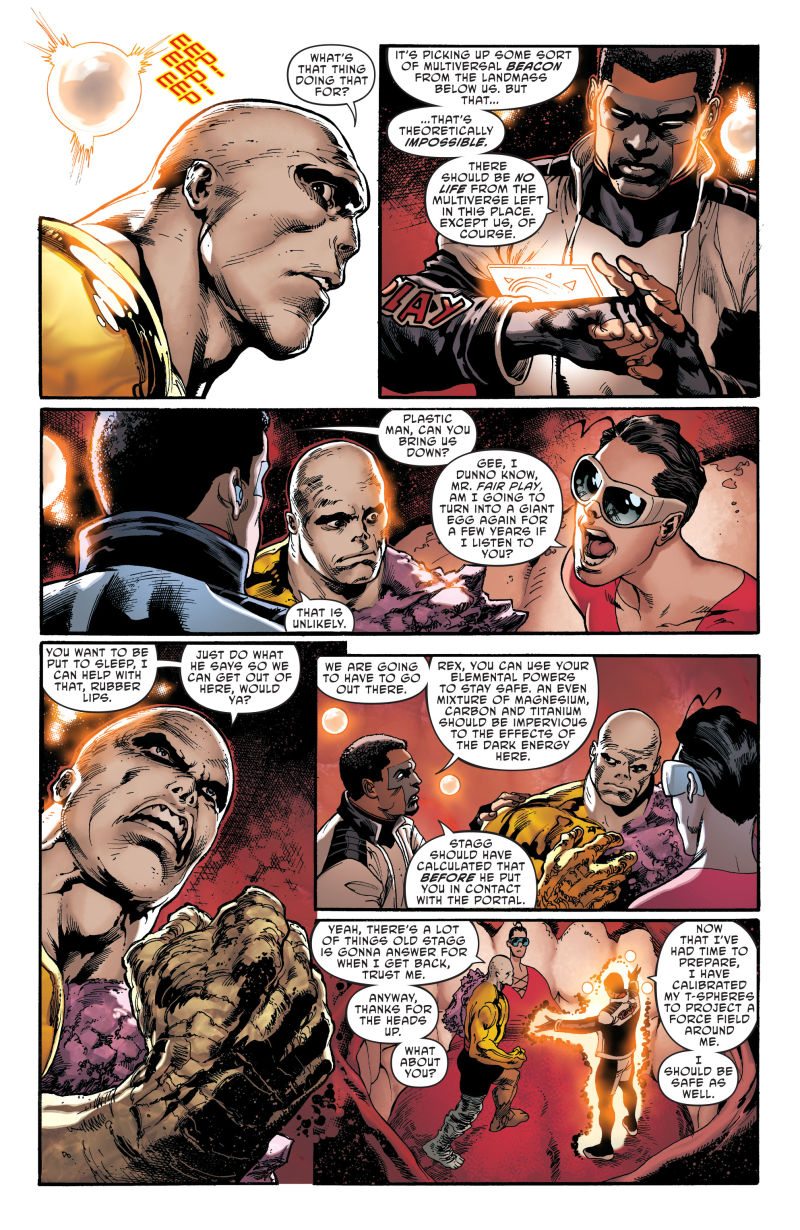 Bound together by fate, united by the spirit of exploration and hope for tomorrow, the Terrifics bound from the Dark Multiverse of Meta! When Mr. Terrific, Metamorpho, Plastic Man and Phantom Girl find themselves literally bound together by a tragic accident, our team of unlikely allies must rely on one another to make their way back home. But a startling revelation on their return trip brings them face to face with a new mystery: where in the universe is Tom Strong?