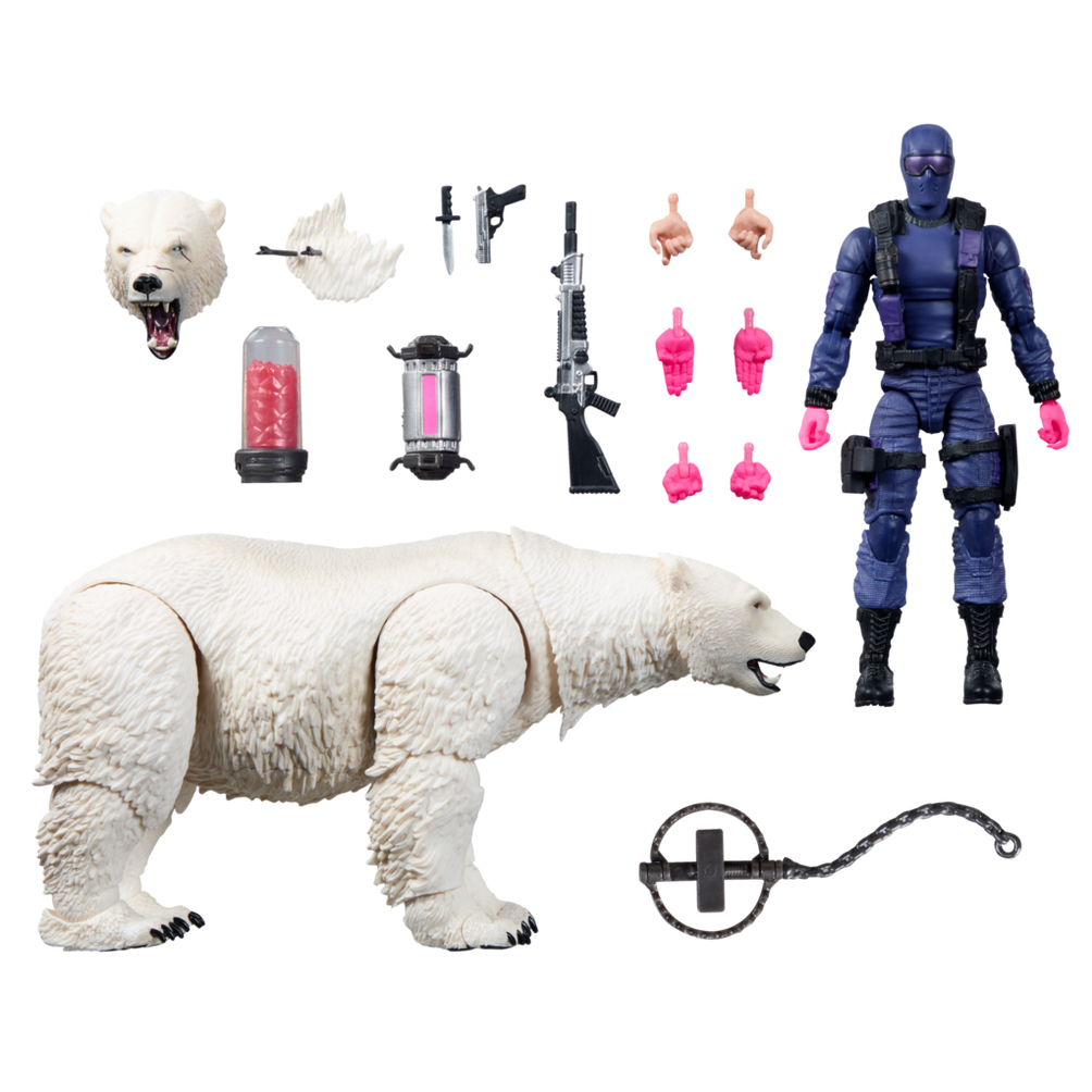 New to the G.I. Joe Classified Series line, Snake Eyes & Polar Bear comes ready for adventure, with multiple points of articulation for high poseability. The Snake Eyes figure contains 15 character-inspired accessory pieces including bear trap with chain, 3 alternate sets of hands, M.A.S.S. collection cannister, catalytic element crystal in a clear container, knife, and weapon accessories. The Polar Bear has and alternate growling head and swappable battle-damaged shoulder piece. Snake Eyes must retrieve the red crystal catalytic element from the Arctic Sea of Ice to fuel the powerful M.A.S.S. Device before he succumbs to the glowing crystal’s radioactive effects or falls victim to a vicious Polar Bear attack!