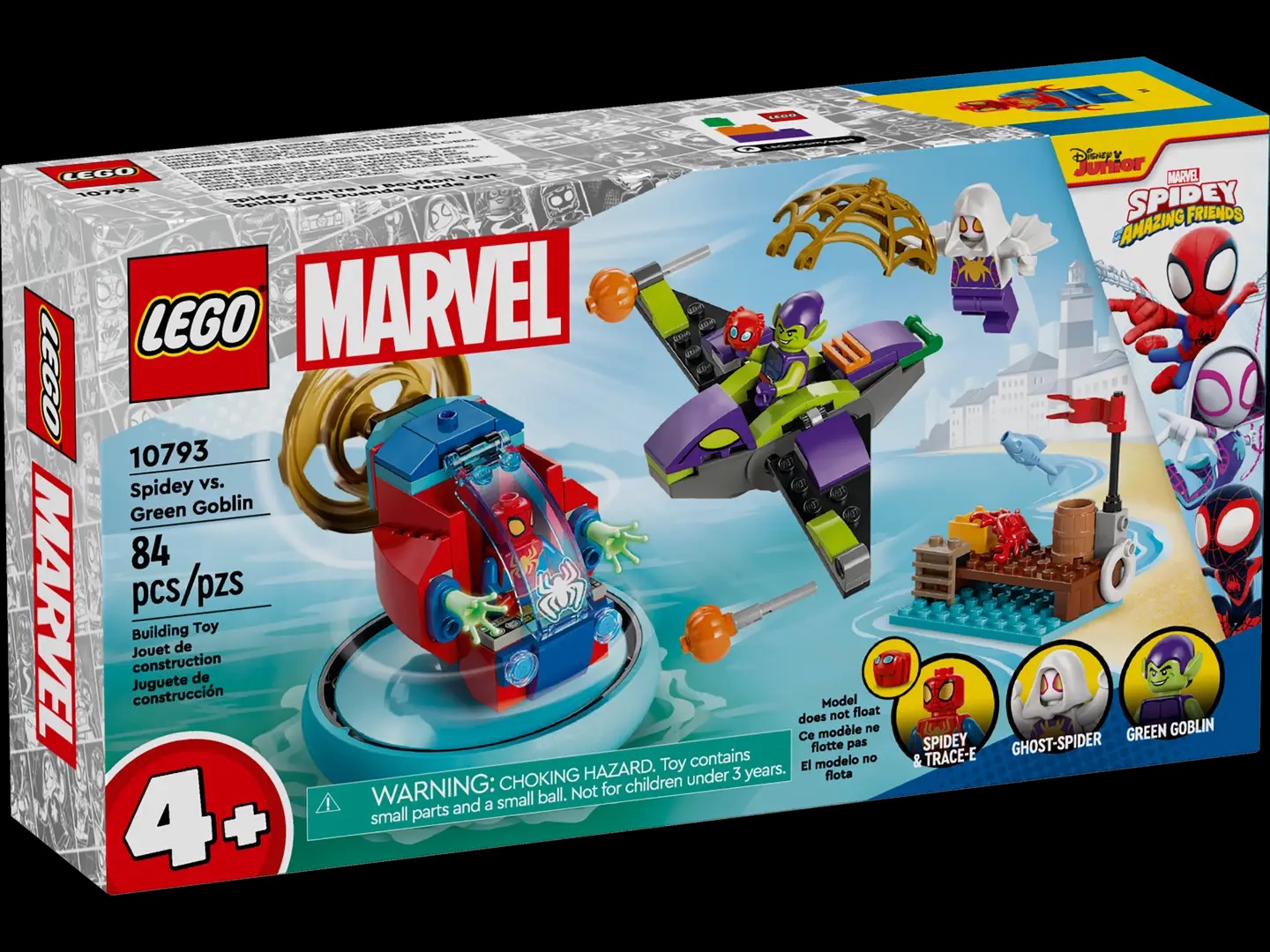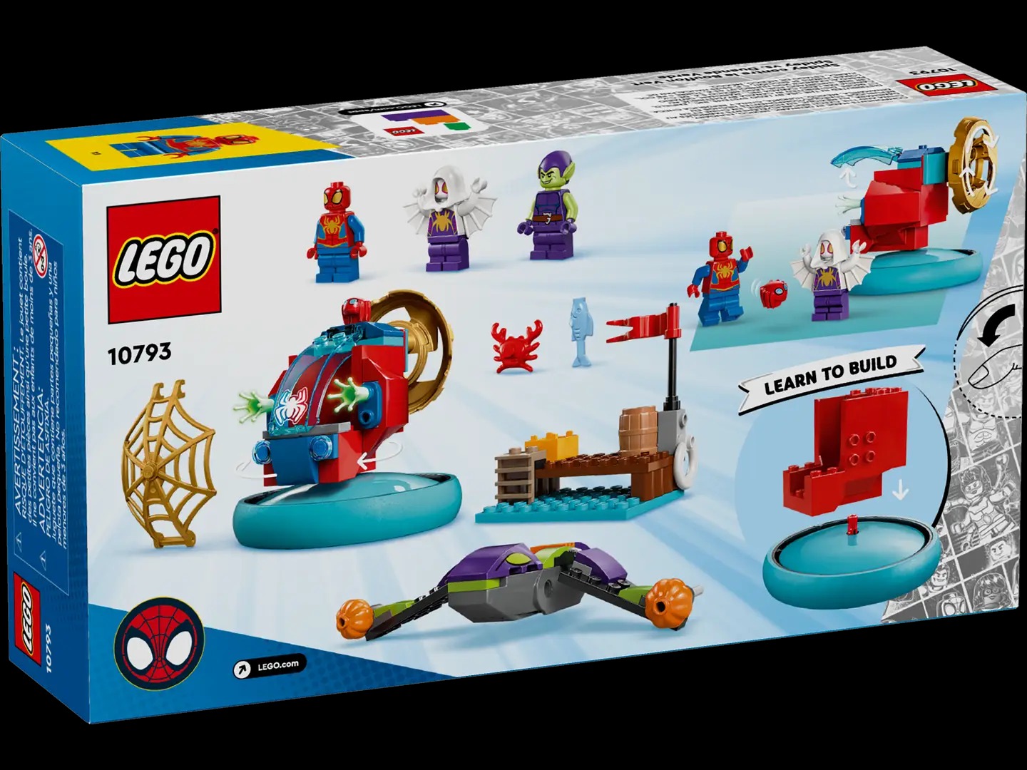 This Disney+ Spidey and His Amazing Friends toy vehicle set includes: a Spidey minifigure and his hover spinner with rotating propeller and lift-up cockpit; a Green Goblin minifigure and his glider with pumpkin projectiles; and a Ghost-Spider minifigure with her large, golden web element. There’s also Spidey’s robot friend Trace-E, sea accessories and a cute crab. The set comes with a cockpit Starter Brick to help get building underway and intuitive instructions in the form of a colorful picture-story guide.