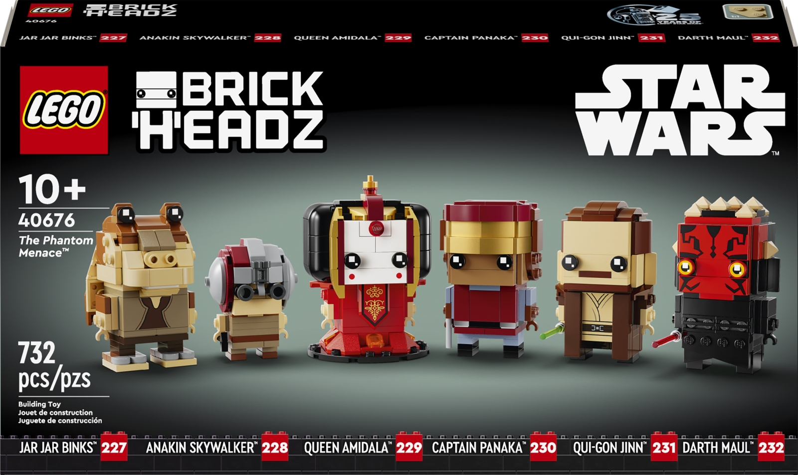Celebrate the 25th anniversary of Star Wars: The Phantom Menace and LEGO® Star Wars™ building sets with this build-and-display set of 6 collectible LEGO BrickHeadz™ figures (40676). A cool anytime gift for Star Wars fans, it features brick-built LEGO figures of Jar Jar Binks, Anakin Skywalker, Queen Amidala, Captain Panaka, Qui-Gon Jinn and Darth Maul, each with baseplates, plus authentic accessories such as young Anakin’s hammer and Darth Maul’s red double-bladed lightsaber.
