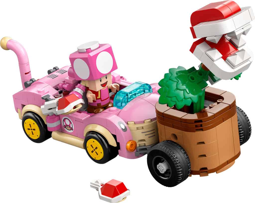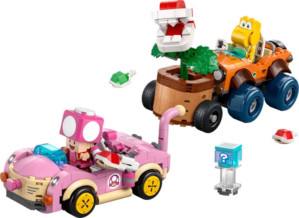 - LEGO® Super Mario™: Mario Kart™ toy playset for kids – Play out a thrilling Piranha Plant Power-Up Pursuit with a Koopa Troopa in the Tanooki Kart and Toadette in the Cat Cruiser