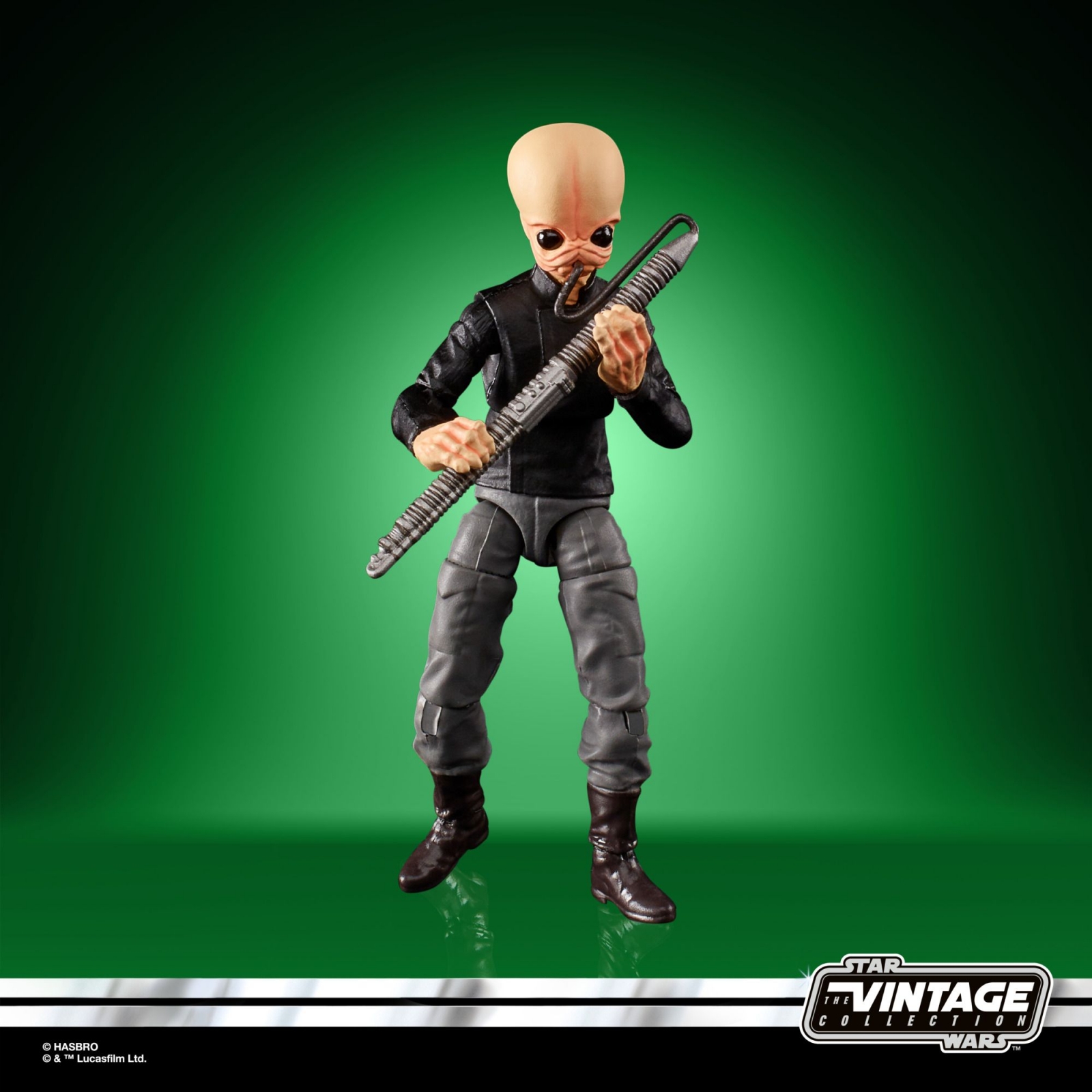 STAR WARS: THE VINTAGE COLLECTION 3.75-INCH scale classic figures and vehicles feature original vintage-inspired packaging and Kenner branding. This Star WARS: THE VINTAGE COLLECTION 3.75-INCH FIGRIN D’AN figure is inspired by the character in STAR WARS: A NEW HOPE. Figrin D’an’s is the rocking frontman for the all-Bith band “The Modal Nodes.” His deft playing of the Kloo Horn for the band earned him the nickname “Fiery” Figrin. Highly poseable with realistic detail, this 3.75-inch-scale figure can be displayed in action figure and vehicle collections. Includes 3 entertainment-inspired accessories.