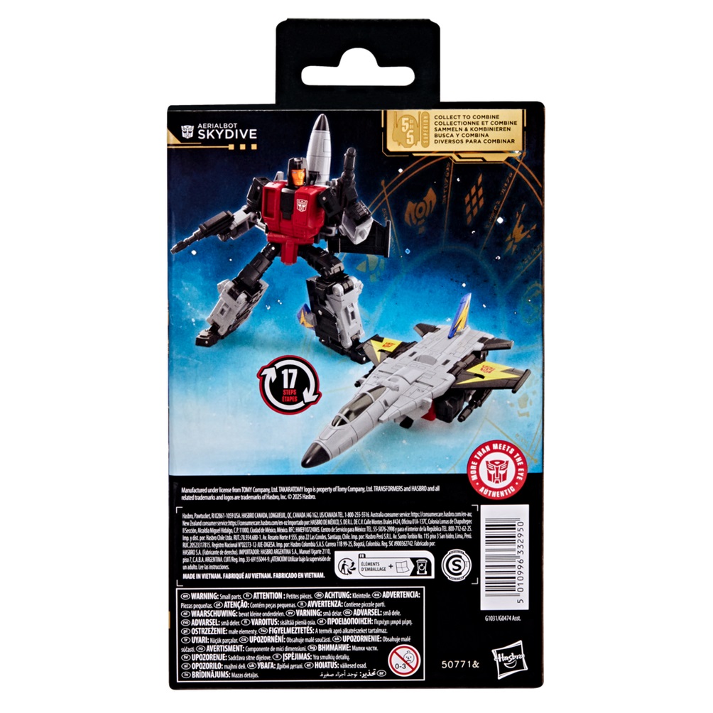 Experience the epic universe of Transformers robots with the Transformers Aerialbot Skydive toy! The 5.5-inch (14 cm) figure converts from robot action figure to jet mode in 17 steps. Combine the Aerialbot Skydive figure with other Transformers Aerialbot action figures (each sold separately, subject to availability) to create the Aerialbot Superion action figure! With intricate poseability and attachable blaster accessories, this Aerialbot Skydive action figure makes an awesome addition to any collection. Look for more Transformers collectible toys (sold separately, subject to availability) featuring favorite characters like Optimus Prime, Bumblebee, Megatron, and more to create a lineup that is — More Than Meets the Eye.