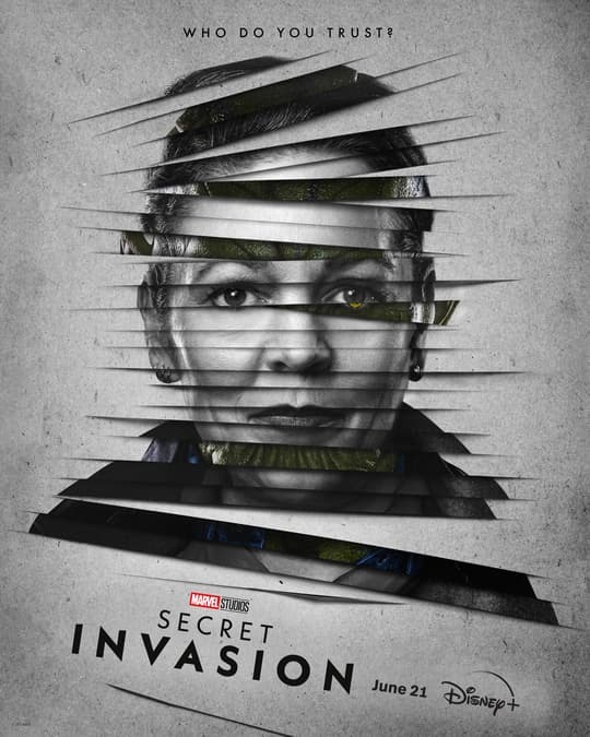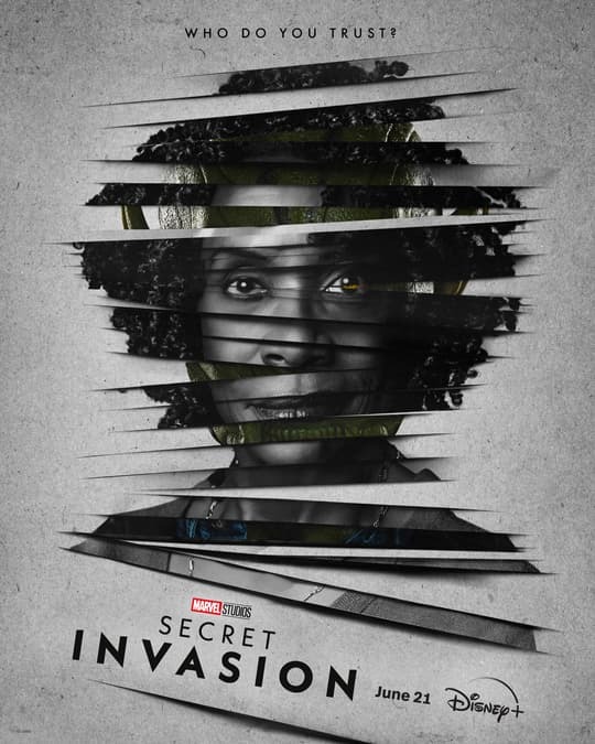 With just a month to go until Secret Invasion premieres on Disney+, Marvel Studios has shared new trailer for the MCU limited series, along with a batch of character posters featuring Nick Fury (Samuel L. Jackson), Talos (Ben Mendelsohn), Maria Hill (Cobie Smulders), Rhodey (Don Cheadle), Everett Ross (Martin Freeman), G’iah (Emilia Clarke), Gravik (Kingsley Ben-Adir), Sonya (Olivia Colman) andPriscilla (Charlayne Woodard). Check them out here…