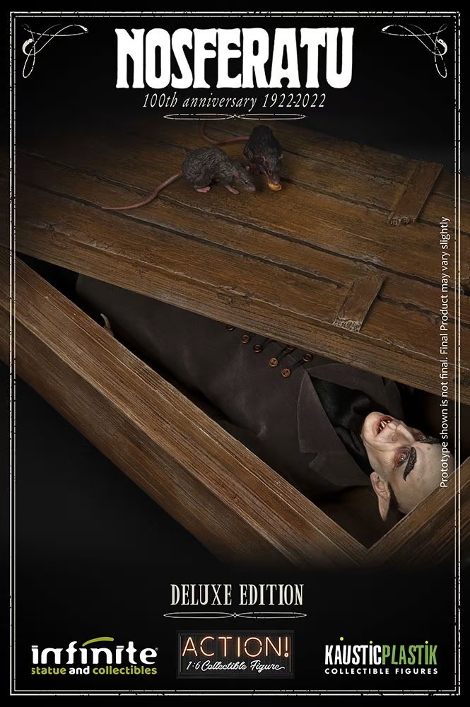 The immortal Nosferatu is brought back to life by the talented team of artists from Infinite Statue and Kaustic Plastik who have skillfully recreated his lugubrious and emaciated figure in incredible detail, lifting from the scenes of Murnau’s famous and beautifully unnerving film. Included with the Deluxe Edition is one luxury movie-accurate coffin for you to recreate the iconic moments that have haunted our dreams for a century, and perhaps, an eternity…..