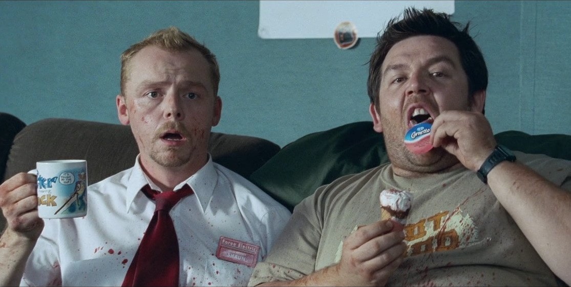 The dialogue is sharp, often coarse, but always funny. The banter between Shaun and his best friend Ed often features some of the best exchanges as they regularly ignore the zombies to tear into each other like a bickering couple. The various comic set pieces are hilarious, combing a terrifying situation with a mundane argument. Such as when they should be screaming in terror and fighting for survival, Shaun and Ed instead argue about which records they can sacrifice when trying to kill a pair of attacking zombies. Or how a clever plan to sneak through a zombie horde by “playing undead” falls apart as Ed and Shaun decide to have an almighty row at maximum volume in front of everyone. I especially like how it seems like the zombies are patiently waiting for them to finish their argument before attacking.