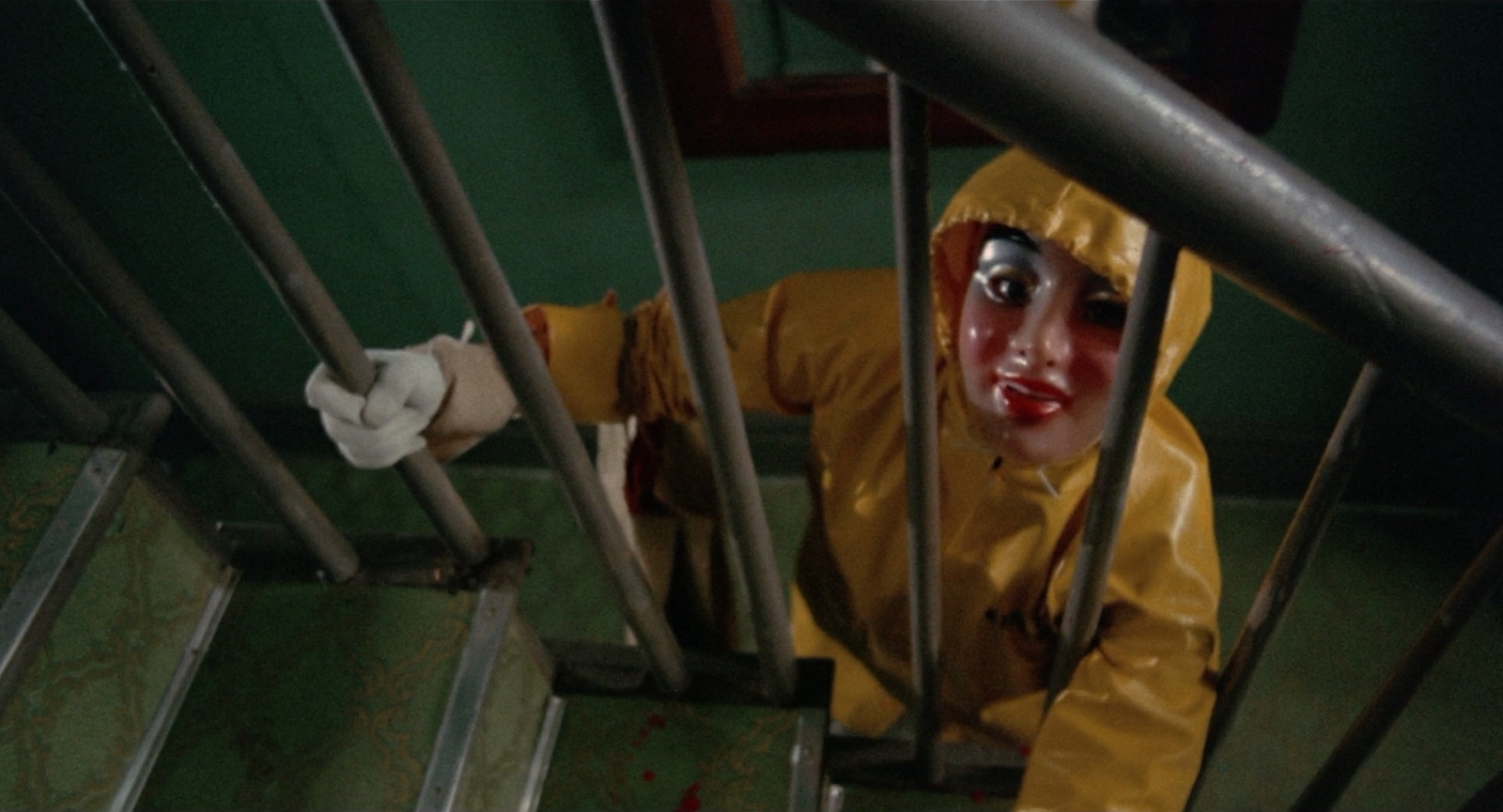 Rather than shocking us with sudden scenes of violence, the film will often show the killer arriving at a scene before their victim. The suspense builds as we wait with bated breath wondering not if the killer will attack but when, the killer’s slight physical frame and bright yellow raincoat standing out as a far cry from the usual hulking, darkly dressed killers of later, more famous slashers. The most striking and unsettling aspect of the killer’s appearance is a transparent plastic mask that obscures their facial features completely, except for their creepy wide and highly expressive eyes.