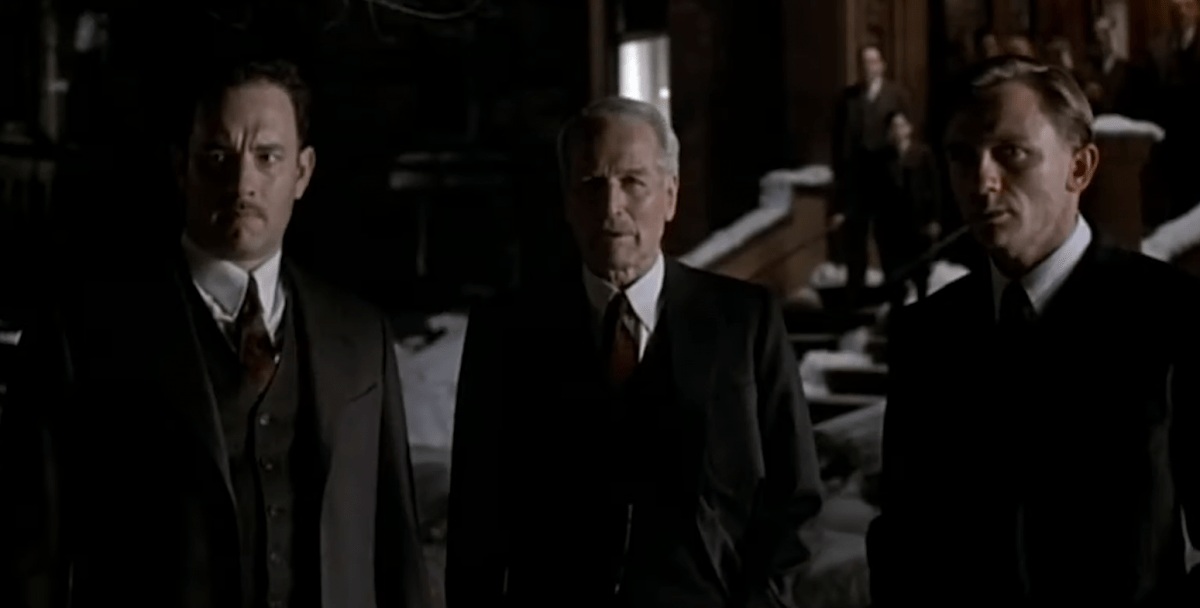 Cast against type, Tom Hanks excels in the role of the elder Sullivan, a far cry from his usual affable persona, Hanks slips into the role with ease making for a surprisingly intimidating presence, while still finding time to project that familiar warmth as the character begins to soften as time goes by. Stealing the film is the legendary Paul Newman as John Rooney, a powerful mobster whose initial grandfatherly air hides a ruthless and fearsome criminal overlord, dominating his every scene with a powerful and commanding presence.