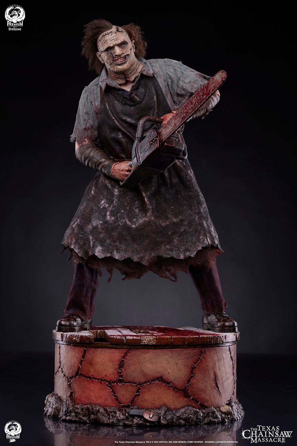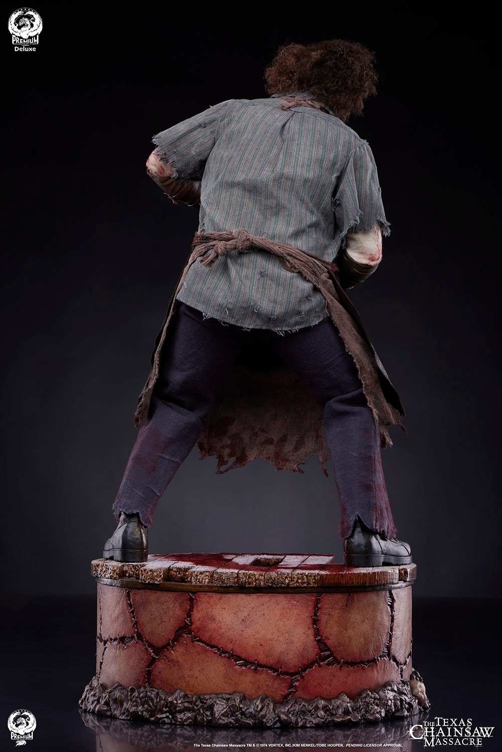 The silent killer’s custom-designed fabric costume is recreated with a distressed collared shirt and tattered pants under his familiar leather apron. Posed in a wide stance and intimidating posture, Leatherface stands atop a sculpted base, topped by decrepit floorboards complete with foreboding claw marks and lined with the skin of his victims crudely sewn together.