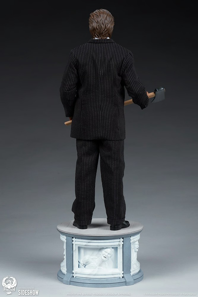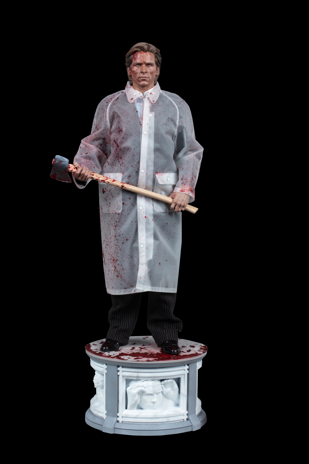 Is that a raincoat? Yes, it is! The American Psycho (Bloody Version) 1:4 Scale Statue boasts a wonderful pinstriped suit beneath the bloodied outer garment. Don’t tell me, let me guess … quarter-scale couture? He’s outfitted with a matching jacket and pants layered over a white and blue dress shirt complete with a red necktie. My god, he even has his gore-covered axe in hand — just don’t touch the watch on his wrist. Try getting a reservation at Dorsia now.