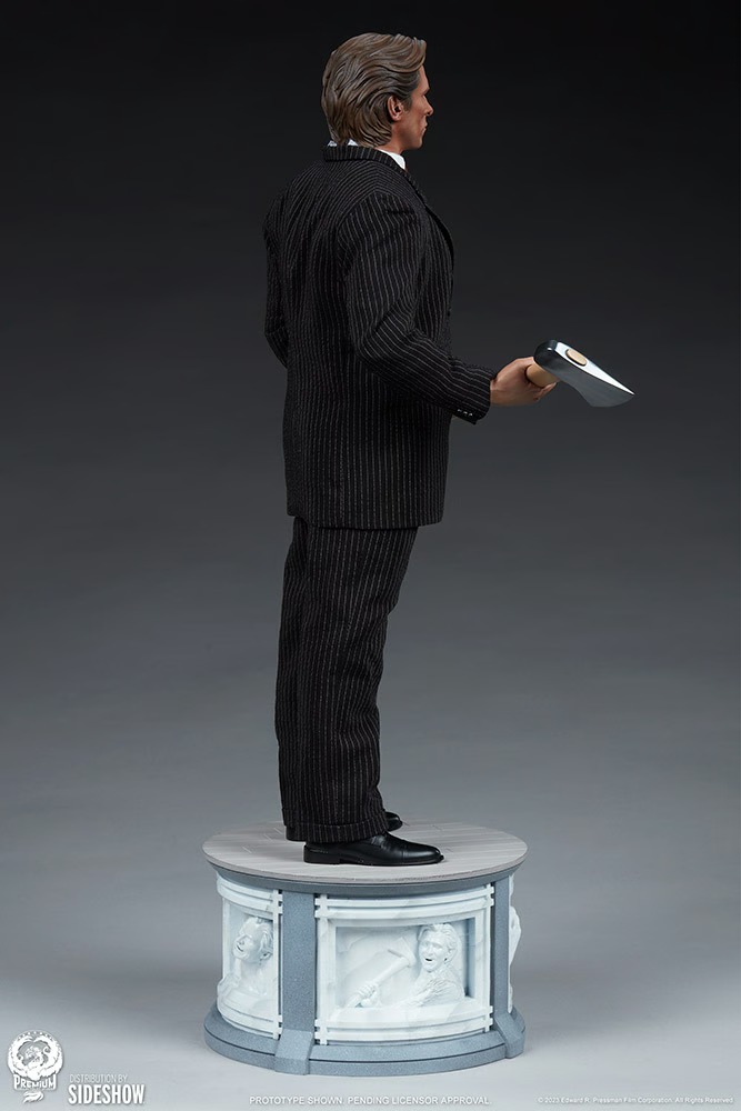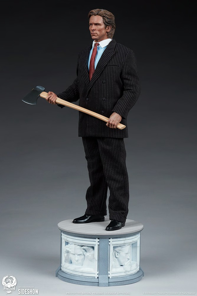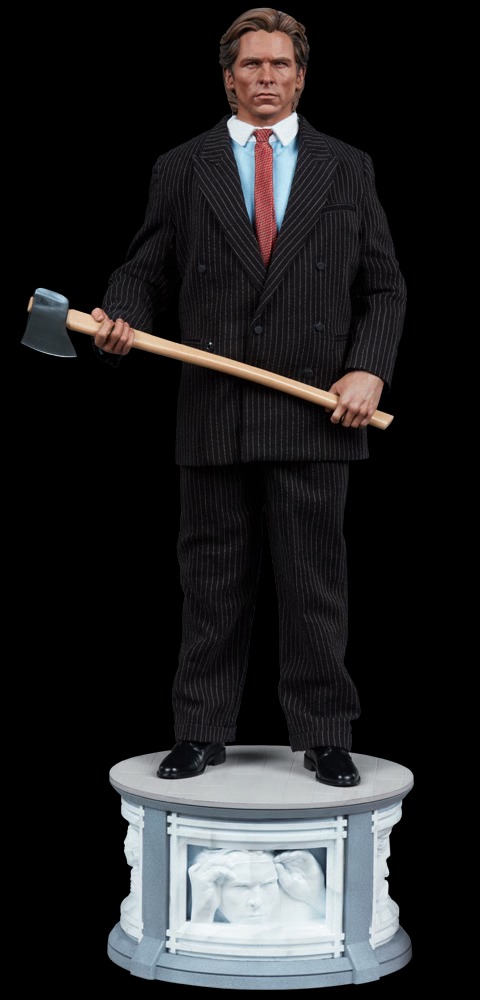 The American Psycho 1:4 Scale Statue boasts a wonderful pinstriped suit. Don’t tell me, let me guess … quarter-scale couture? He’s outfitted with a matching jacket and pants layered over a white and blue dress shirt complete with a red necktie. My god, he even has his silver-headed axe in hand — just don’t touch the watch on his wrist. If only he also came with a reservation at Dorsia!