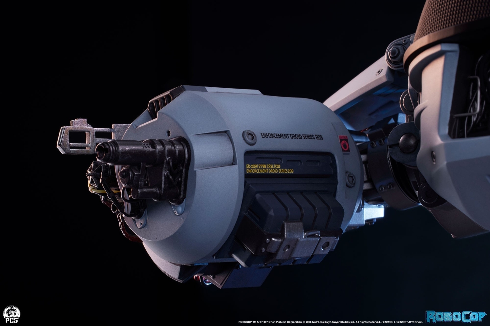 ED-209 stands atop a sleekly designed pedestal base featuring the OCP logo, armed and ready to pacify any perceived threat.