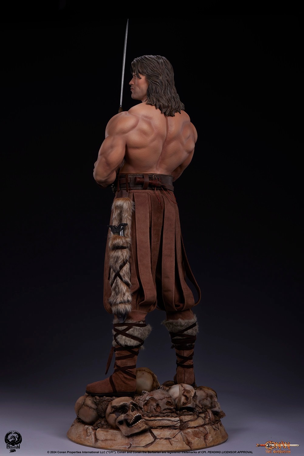 Clutching the Atlantean sword with both hands before him, every muscle in Conan’s body appears ready for the next challenge that awaits him. The beautiful paint work on the statue emphasizes the expertly sculpted musculature of this larger than life warrior. Standing atop an environment base littered with skulls, Conan appears ready for his next adventure.