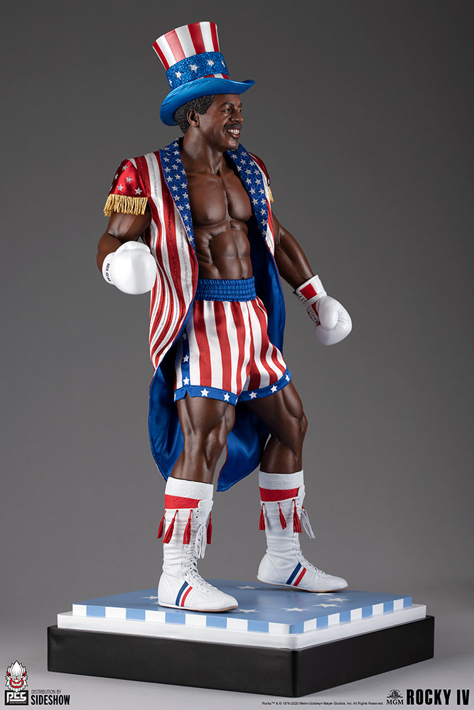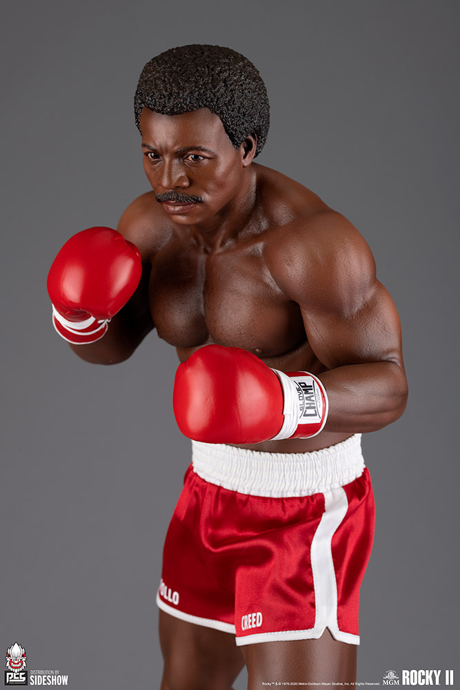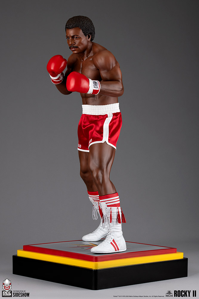 Apollo Creed takes to the mat in this extremely detailed and lifelike 1:3 scale collectible statue based on the iconic Rocky film series, expertly sculpted in the likeness of actor Carl Weathers. The heavyweight champion boxer measures 23” tall, standing on a 13″ wide black, yellow, red, and gray boxing ring canvas base detailed with a star in the center. Light on his feet and boasting a muscled physique, Apollo Creed keeps his fists raised in anticipation of a rematch versus series protagonist Rocky Balboa.