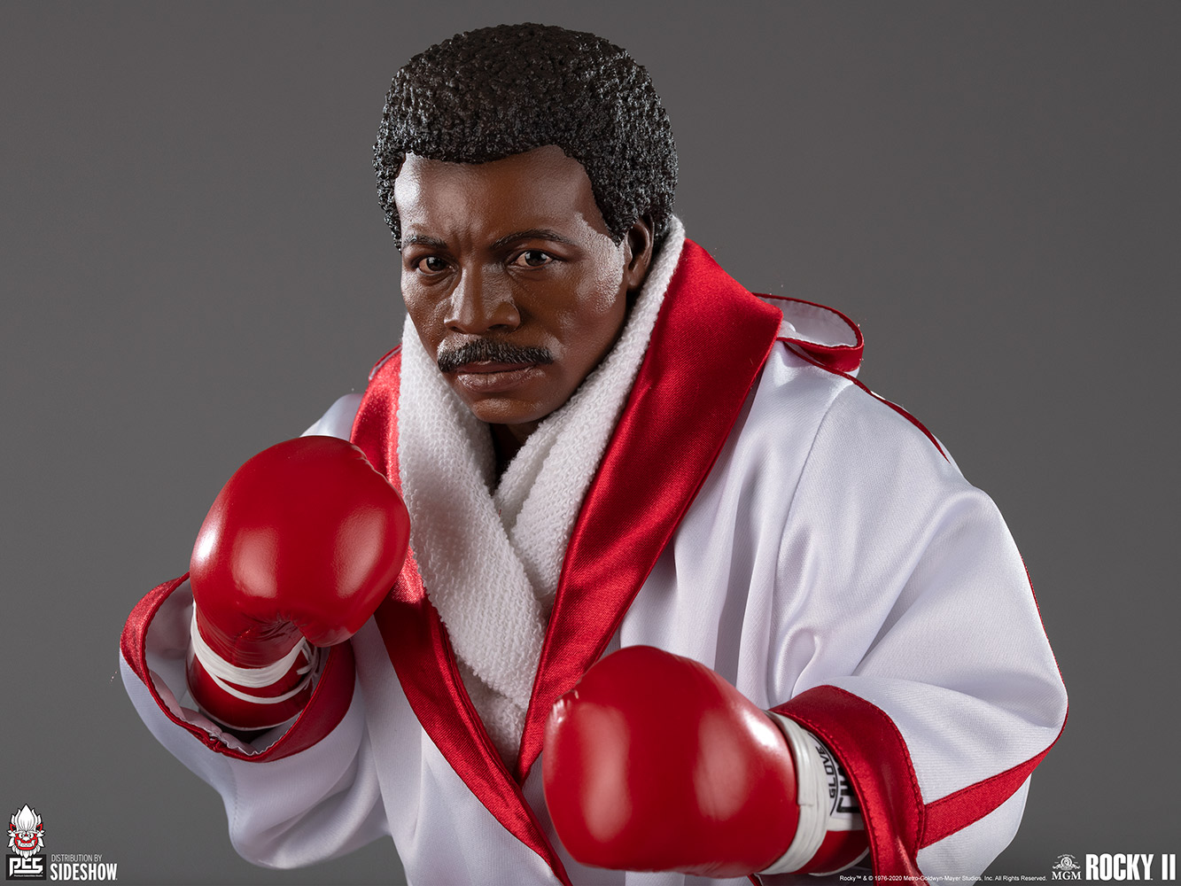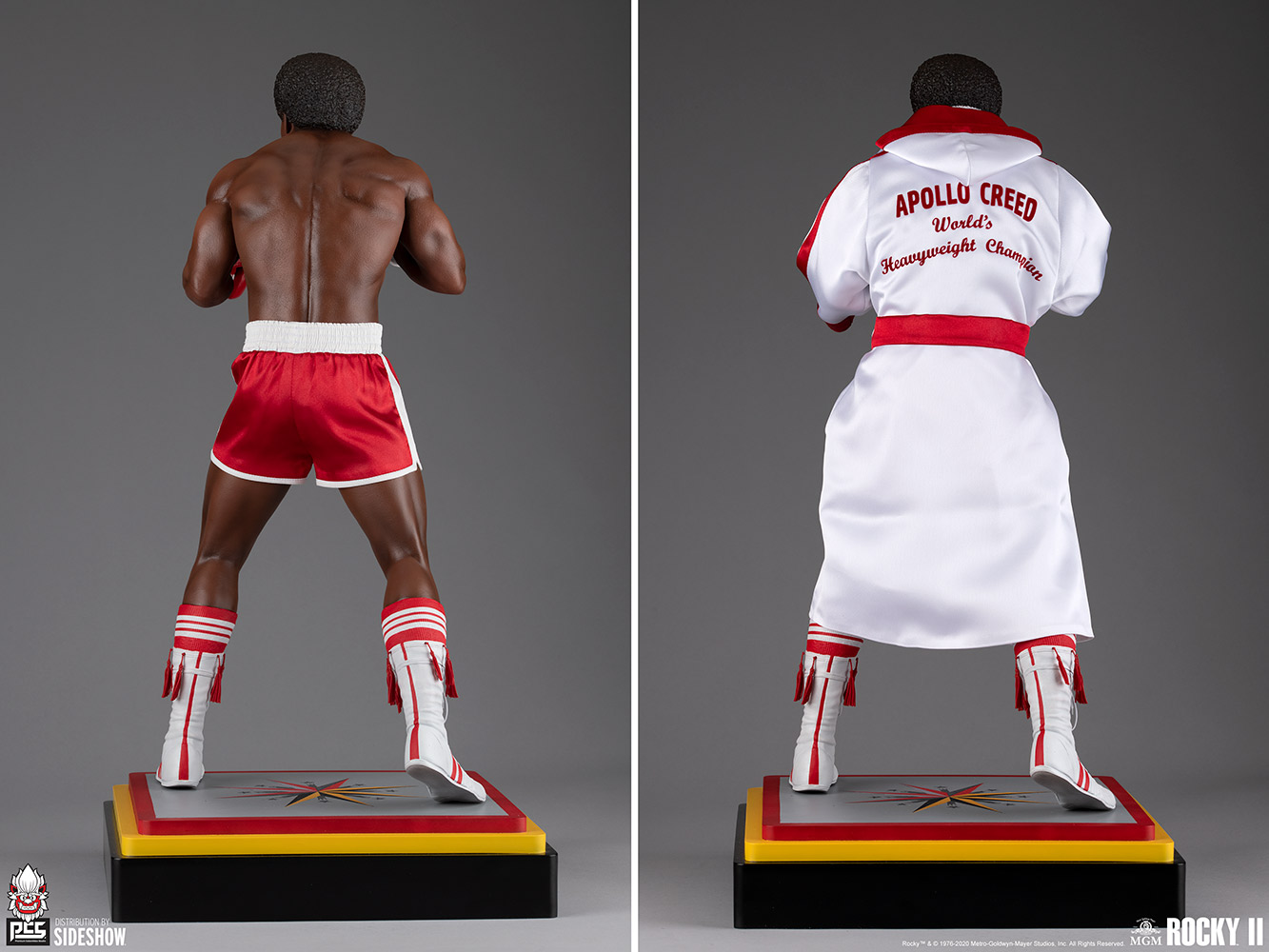 The Apollo Creed 1:3 Scale Statue – Rocky II Edition features a mixed media costume with custom tailored fabric elements to give collectors multiple display options on their shelf. His fabric red and white shorts feature an elastic-style waistband and his name on the thighs, and the collectible additionally includes a removable white and red entrance robe emblazoned with his World Heavyweight Champion title on the back. A display rack is included for when the robe is not being worn. The figure has sculpted red boxing gloves as well as sculpted socks and boots in a matching red and white color pattern. Fans can recreate this heavy hitter’s signature cinematic appearance on your shelf by pairing him with the Rocky II 1:3 Scale Statue by Premium Collectibles Studio, sold separately.