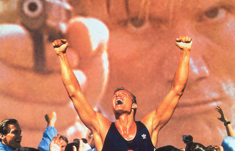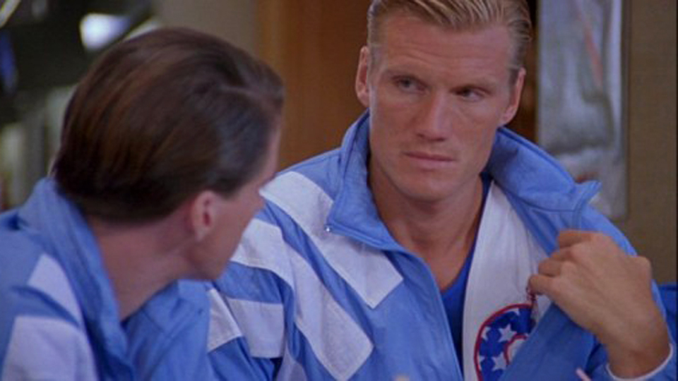 In the film, Dolph plays Eric, an East German Pentathlon supremo working under the iron fist of a maniacal head coach (played by David Soul). Said coach is a leftover relic of Nazi occupied Germany and in the film becomes a key orchestrator of a neo-Nazi terrorist movement. After winning Olympic gold, Eric flees to America with the US team. There he descends into depression and isolation, eventually becoming a grill chef for a sympathetic diner owner. It’s in the US Eric witnesses the fall of the wall, but has this lingering sense of listlessness. He’s no longer interested in competition, getting drunk and out of shape. That is, until he is persuaded to compete again, for the US. At this point his past catches up with him and his sadistic former coach returns to make Eric’s life hell (whilst conducting his own nefarious terrorist activities).