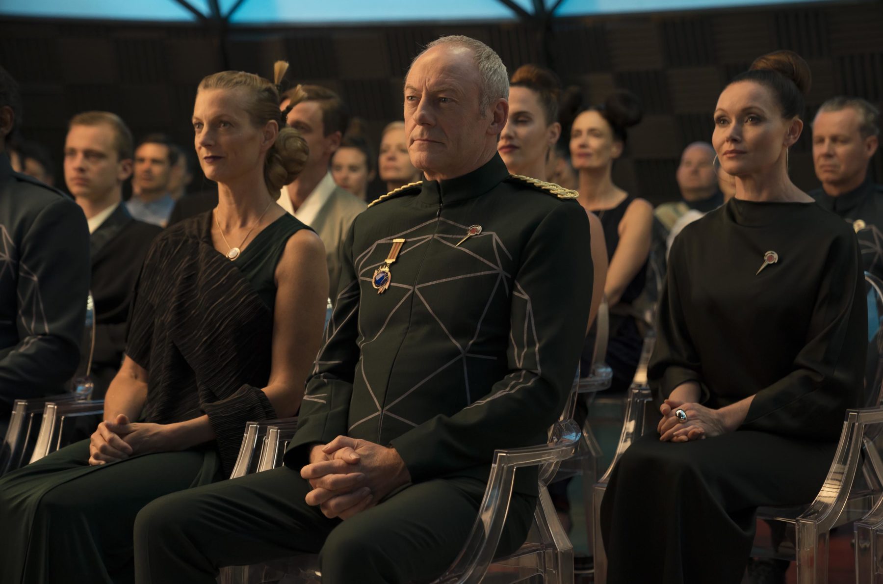 On Planet Terra – in the first quarter of the 26th Century – highly decorated officer Silas (Bryan Cranston) is receiving high praise for bravery in a recent mission from General Olin (Liam Cunningham); however due to the General’s speech in which he brought Silas’s wife – Vera (Essie Davis) – in on the praise, the following evening for the aforementioned spouse doesn’t go to well as later Silas makes sure she knows her place. It becomes apparent this marriage is one of necessity and not of love, as the two spend numerous moments away from each other.