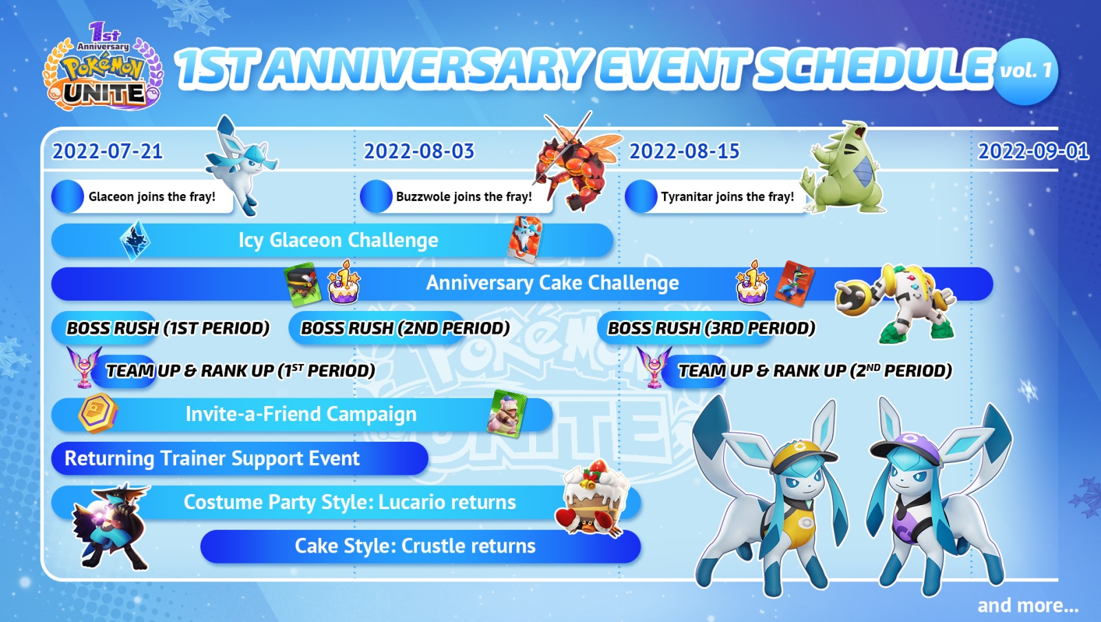 There’s three new Unite licenses being added to Pokémon UNITE over the coming weeks with Glaceon arriving on the 21st, Buzzwole on 3rd August and Tyranitar on the 15th August. Though these won’t be the only licenses making their debut during the anniversary period as three more will arrive during September.