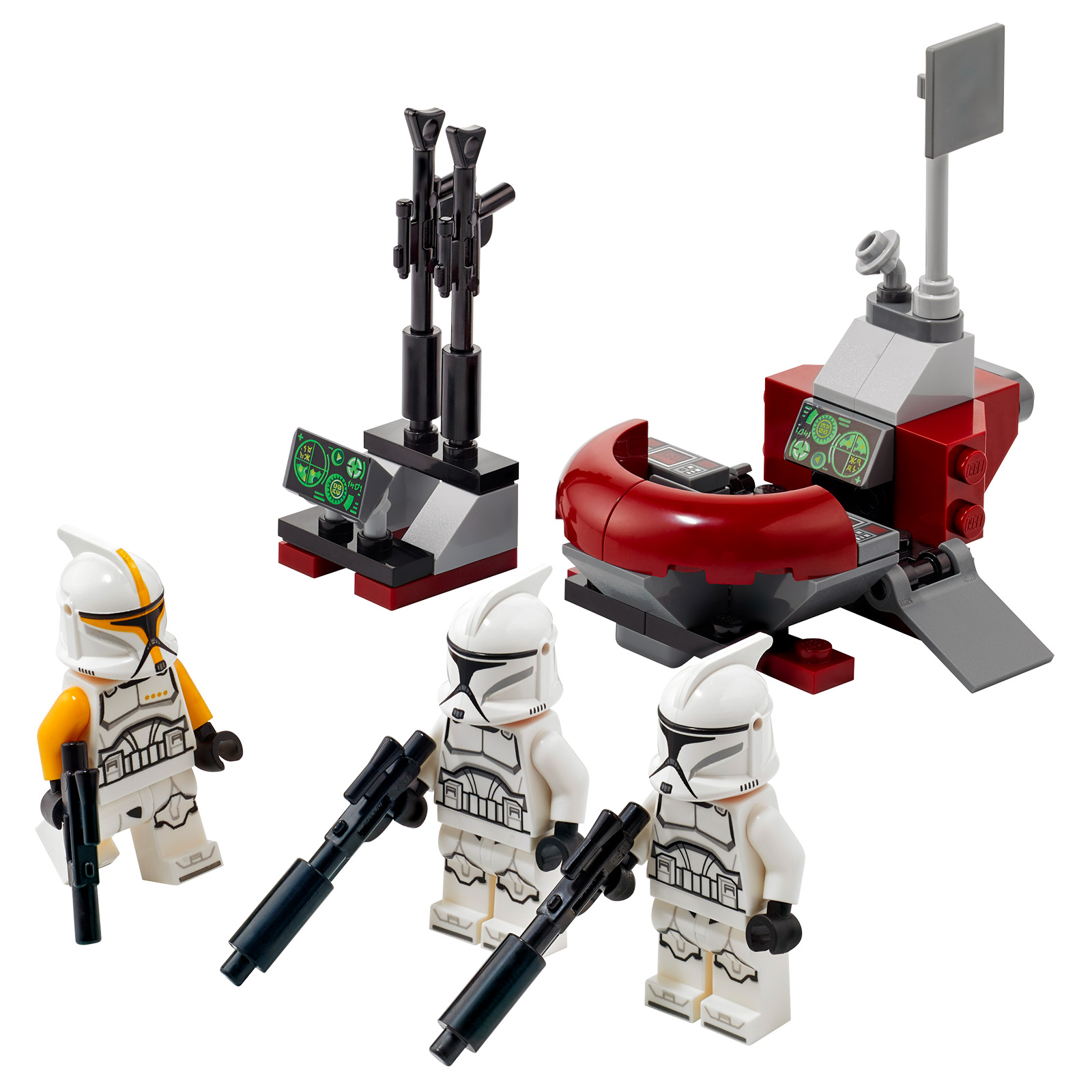 - 3 LEGO® minifigures for role play – Clone Commander with a blaster pistol and 2 Clone Troopers, each with a blaster rifle. This 66-piece building toy is for ages 6 and up