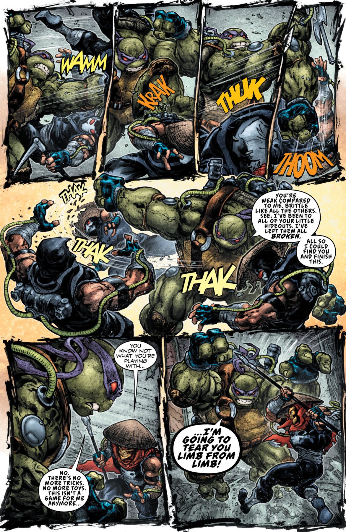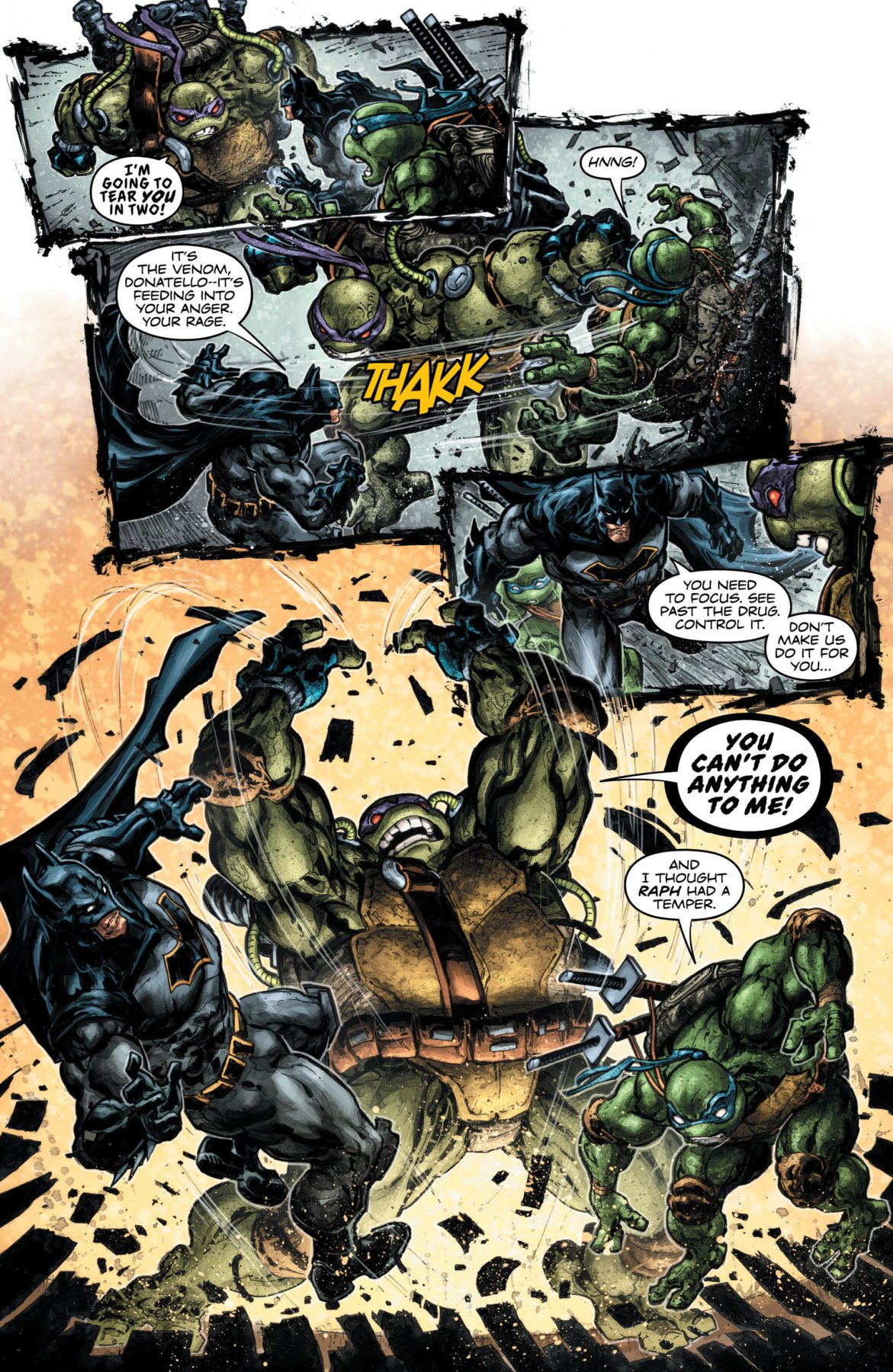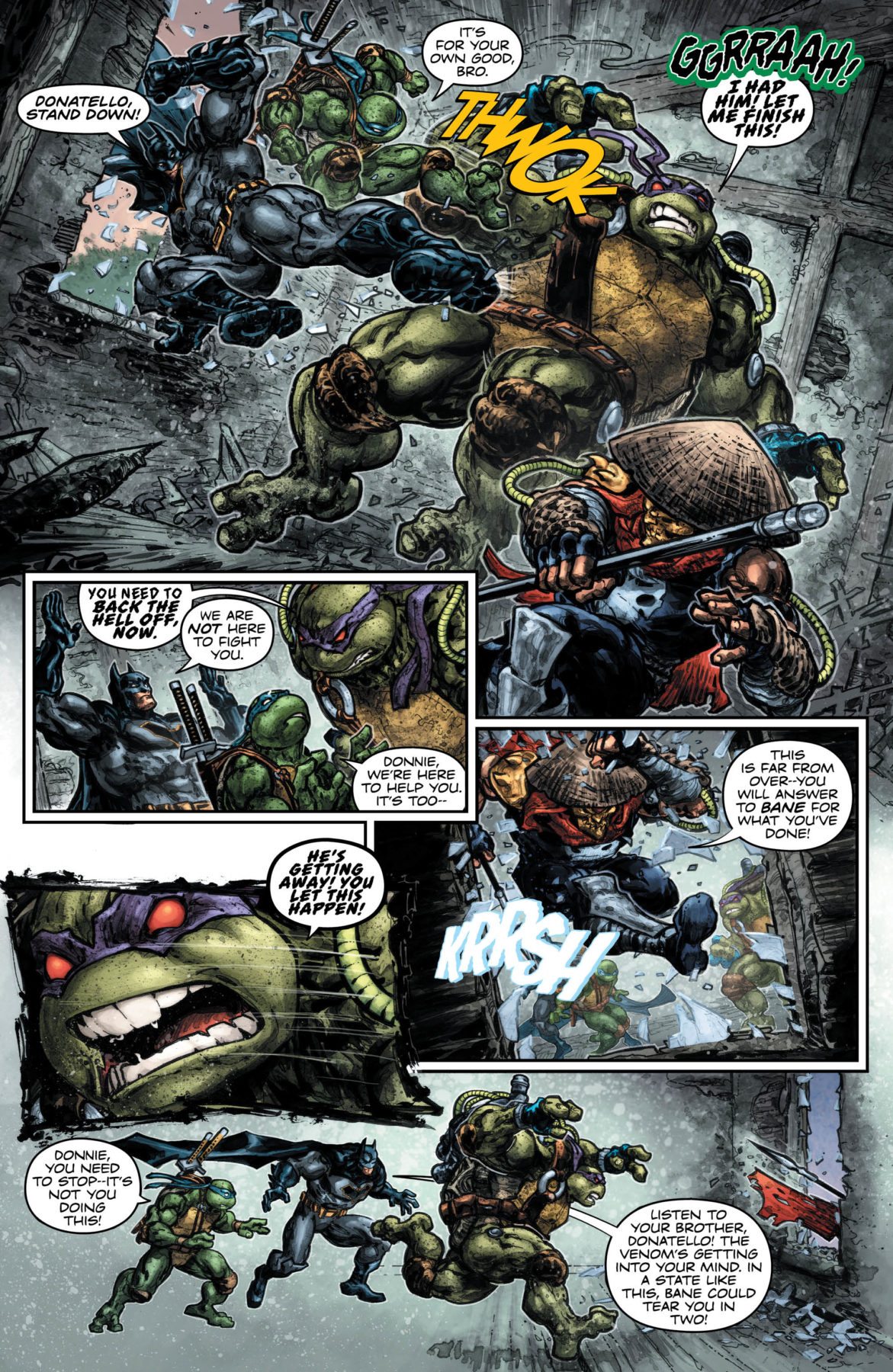 A Venom-charged Donnie wages a brutal, one-Turtle war on the Foot Clan. Batman has to stop him and remind him of who he really is; someone who uses smarts—not brawn—to take down the bad guys. Damian and Raphael pay a visit to the Lazarus Pit to try and help a wounded Splinter. Then Batman tries to turn a former foe into an ally as part of a desperate attempt to finally end the reign of Bane.