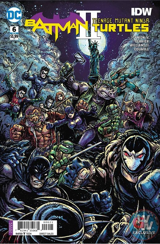 It’s the final battle as the Bat-family and the Turtles face off against Bane and the Foot Clan on Liberty Island. With America’s great symbol of freedom watching over them, the Dark Knight and the Heroes on a Half-Shell must bring Bane’s tyrannical rule over New York to an end. And don’t forget about Shredder. What role will that deadly villain have to play in all of this? It’s all-out action in this exciting series conclusion.