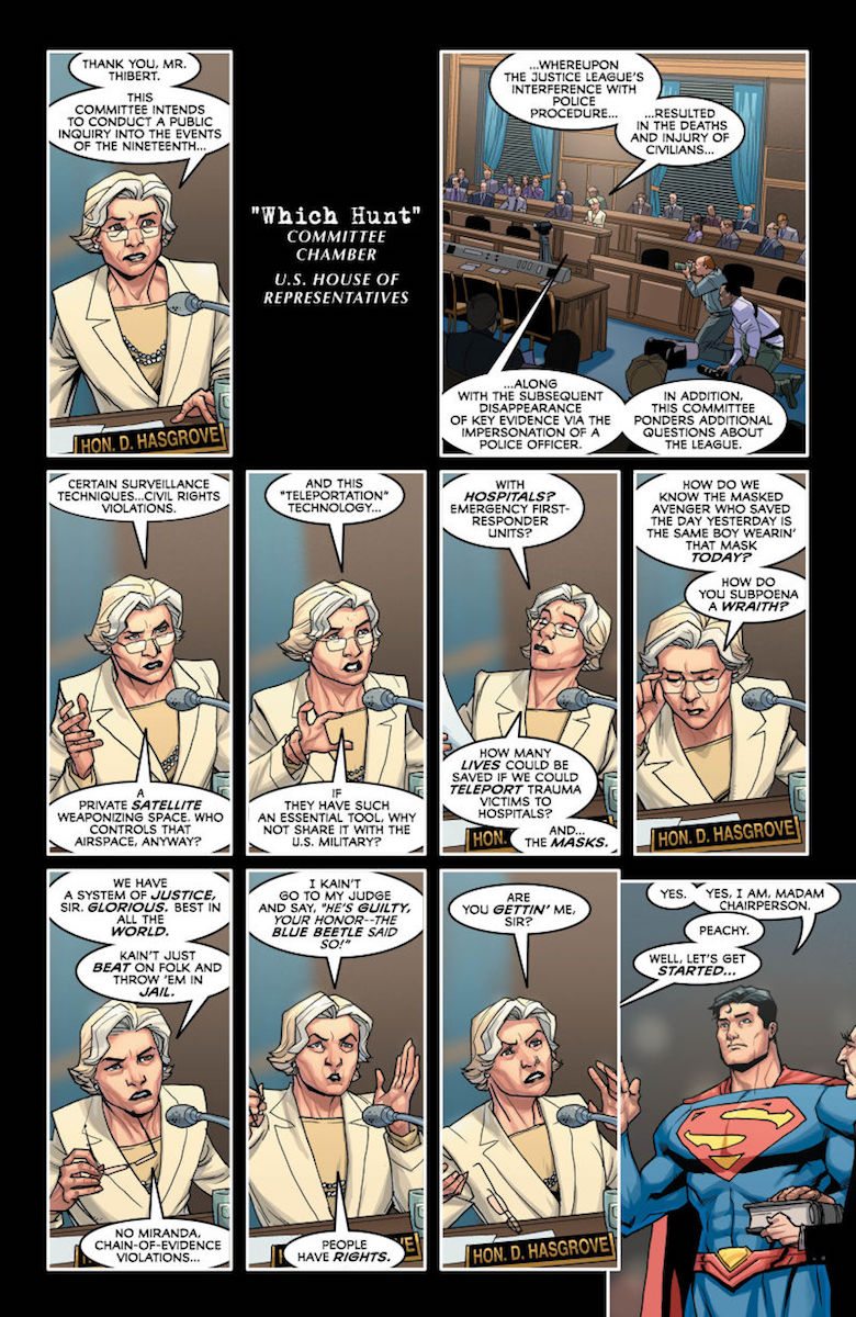 “JUSTICE LOST” part three! Footage of a major Justice League failure ends up on an extremist website, going viral across social media and prompting a Congressional investigation of the team. As public debate explodes over America’s trust in the Justice League, the team faces a crisis of confidence in Batman and his methods, which ultimately highlights fractures within the team over civil rights and methodology.