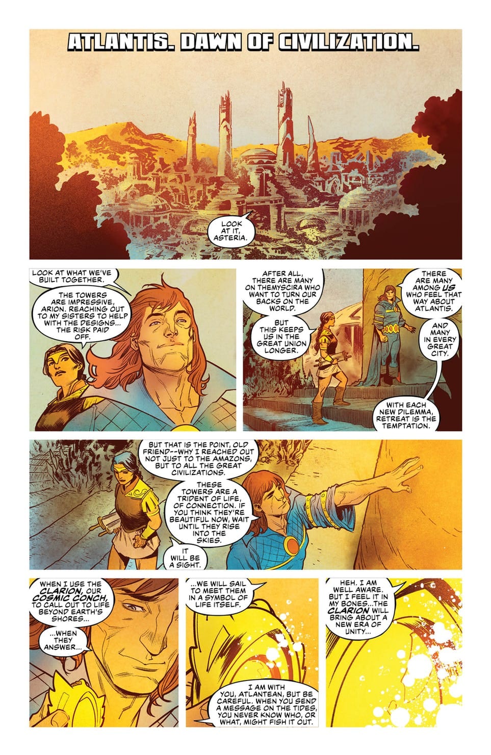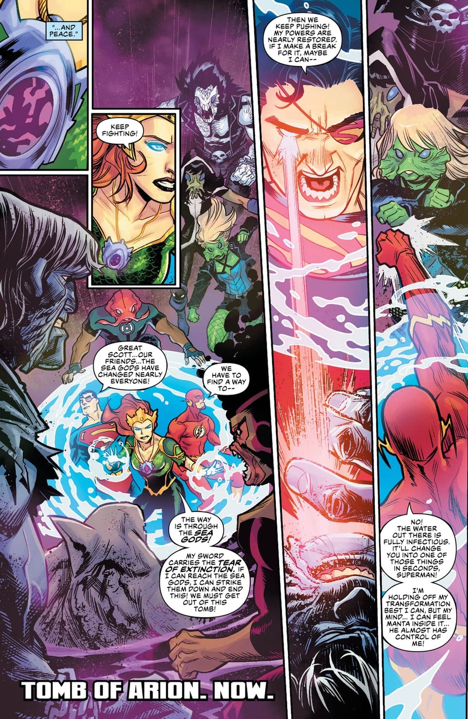 “DROWNED EARTH” finale! Aquaman faces the truth behind Atlantis’ past and must find a way to reclaim the power of his birthright or watch the floodwaters drown everything he has ever loved! With the world at stake and the Justice League on their last sea legs in their battle against the Ocean Lords, Arthur makes the ultimate sacrifice to return balance to land and sea!