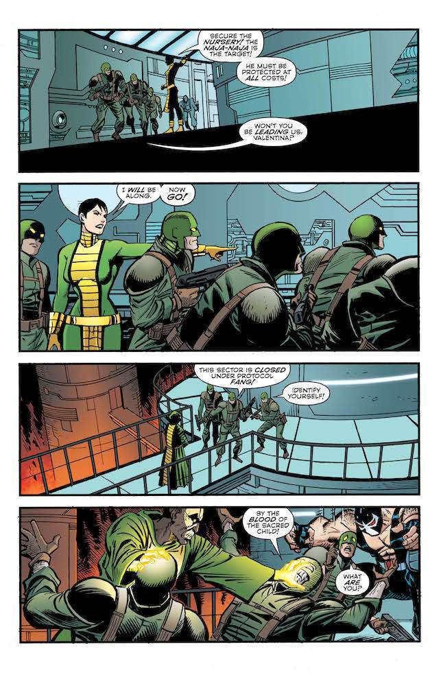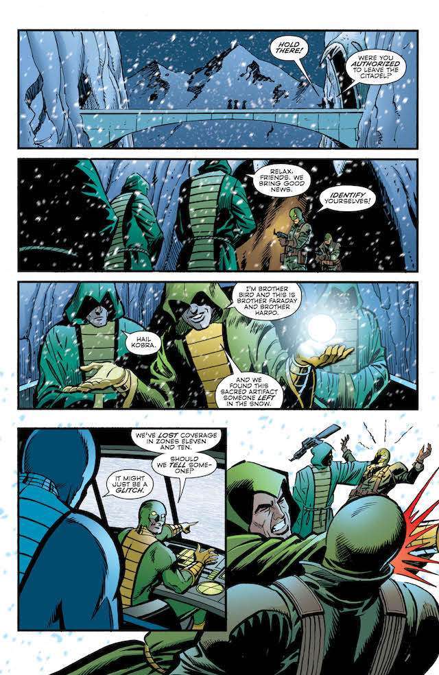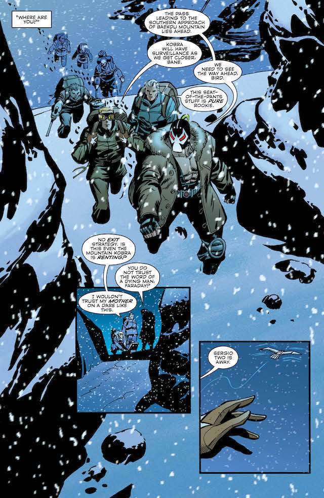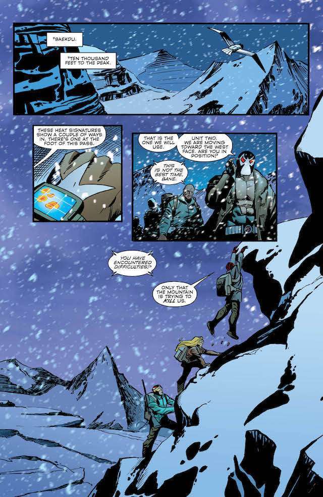 The penultimate issue of this year-long event starts and ends with action, as Bane and his company of villains invade Kobra’s mountain stronghold with the aim of kidnapping the infant Naja-Naja. But one of Bane’s newfound allies is actually his oldest enemy: Batman! The globe-spanning, universe-rocking gangster epic begins its climax here! Who will live? Who will die? And what will happen when the wrath of Kobra falls on the man who broke the Bat?