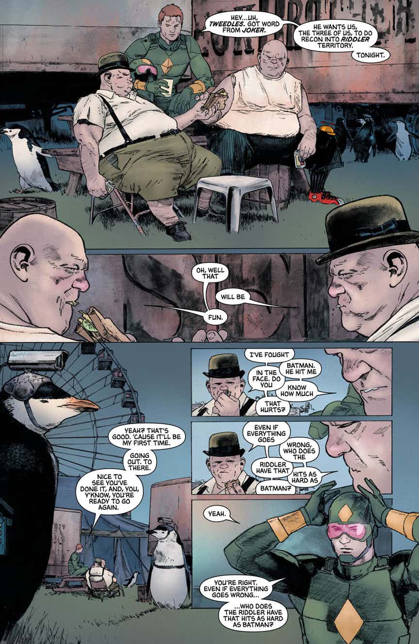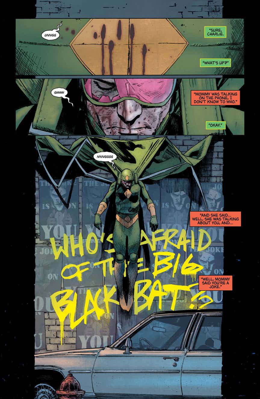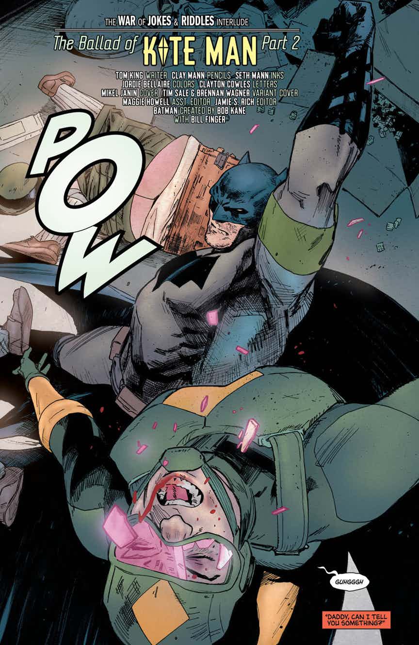 “THE BALLAD OF KITE MAN” part two! In our second “War of Jokes and Riddles” interlude, it’s the making of a super-villain! He’s been pushed by Batman to snitch on The Joker, and cajoled by The Joker to betray Batman—now, the flunky who would be Kite Man finally snaps. He’s lost everything, and a life of crime is the only way to go.