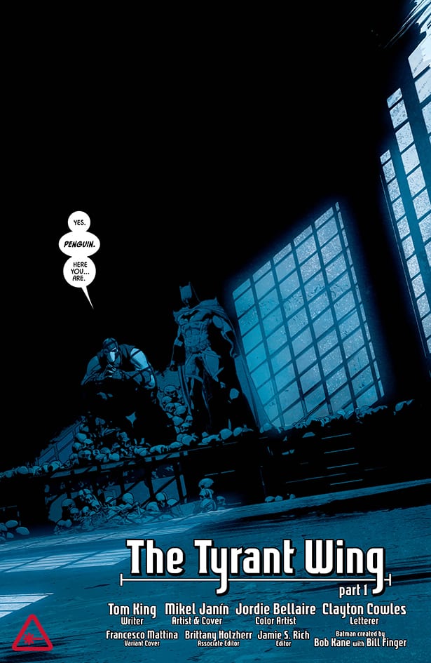 “The Dark Knight waddles into a turf war with the Penguin! Still reeling from the attacks on his Bat-Family and reputation, the Caped Crusader looks to track down the mysterious operator lurking behind the scenes in Gotham City. As the hunt rages on, Batman runs “a fowl” of Oswald Cobblepot. But the Penguin is on Batman’s side for once, and the crime boss sees dangerous things on the horizon. How can he convince the Caped Crusader he’s on the level?”