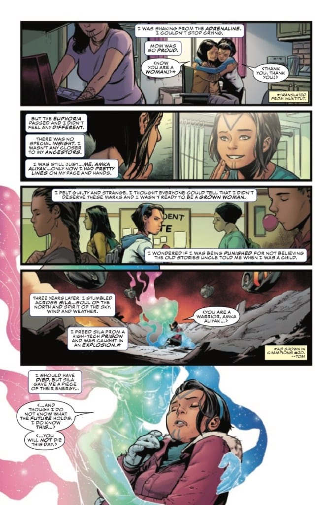 The spirits of the North stir and Snowguard must answer their call! Amka Aliyak’s past and present collide as she strives to understand the power she’s been given and where she belongs. Take a deep dive into Marvel’s newest young hero in this special supersized Champions issue.