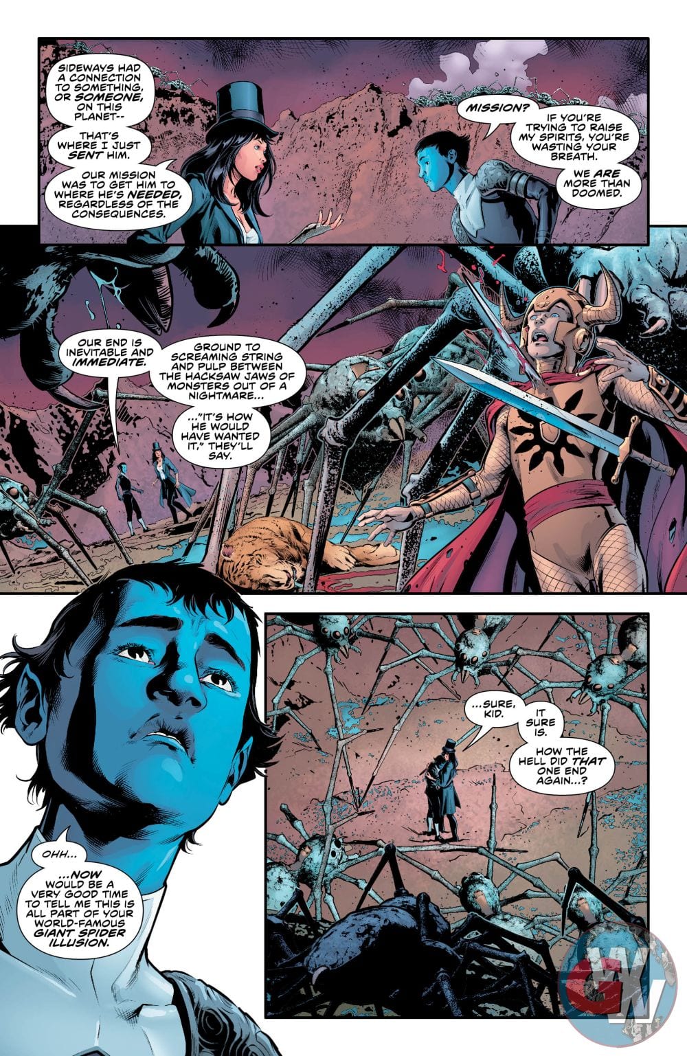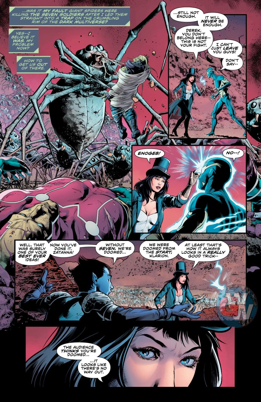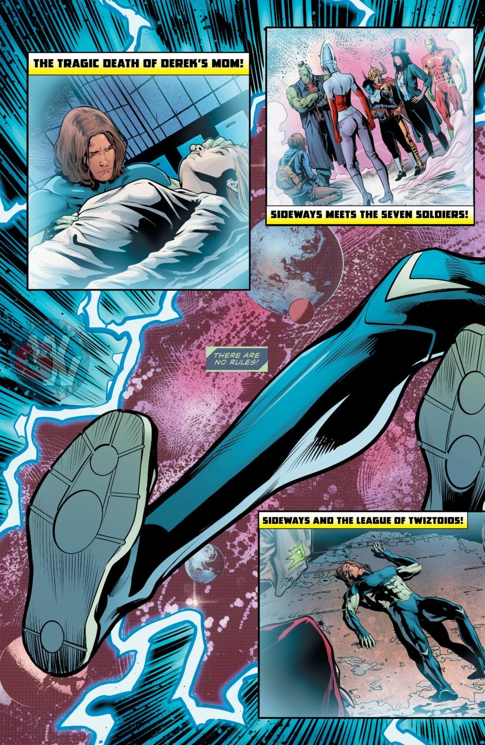 Sideways unleashes his “super” secret weapon against Perrus in an effort to free the oppressed people and escape to his home dimension. He’ll get some additional help from the newly discovered Seven Soldiers, but only if someone makes a heroic ultimate sacrifice. Plus, a bonus backup story in which Sideways meets the Unseen!!
