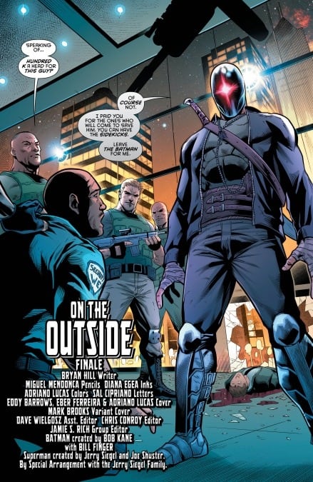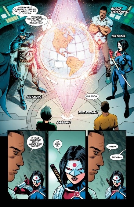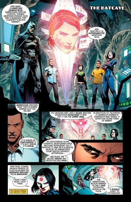 Then, the pulse-pounding “On the Outside” storyline hurtles toward its cataclysmic conclusion! Batman has tasked Katana, Black Lightning, the Signal and Orphan (a.k.a. Cassandra Cain) with stopping a rogue operator using alien technology that can crack into any mind on Earth! What does this case have to do with the Brainiac Files seen in JUSTICE LEAGUE: NO JUSTICE #1? And how does Amanda Waller factor in? Guess you’re “outside” of Batman’s circle of trust…for now.