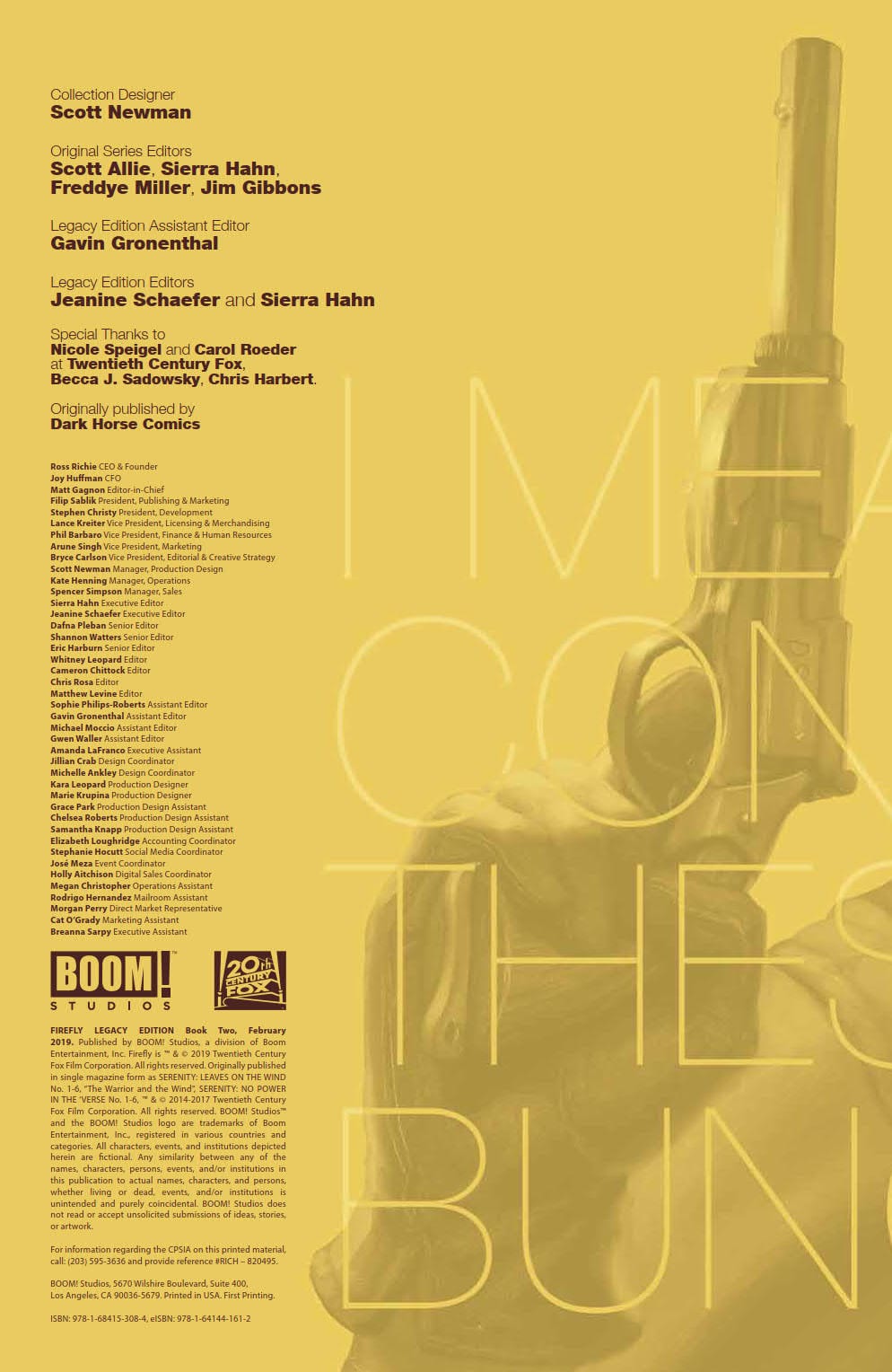 BOOM! Studios presents the second of two Firefly Legacy Editions. Collecting all previously released Serenity comics in an all-new value-priced format, no fan can afford to miss this official follow-up to Joss Whedon’s (creator of Buffy the Vampire Slayer) critically-acclaimed film Serenity, collected in one place for the first time!