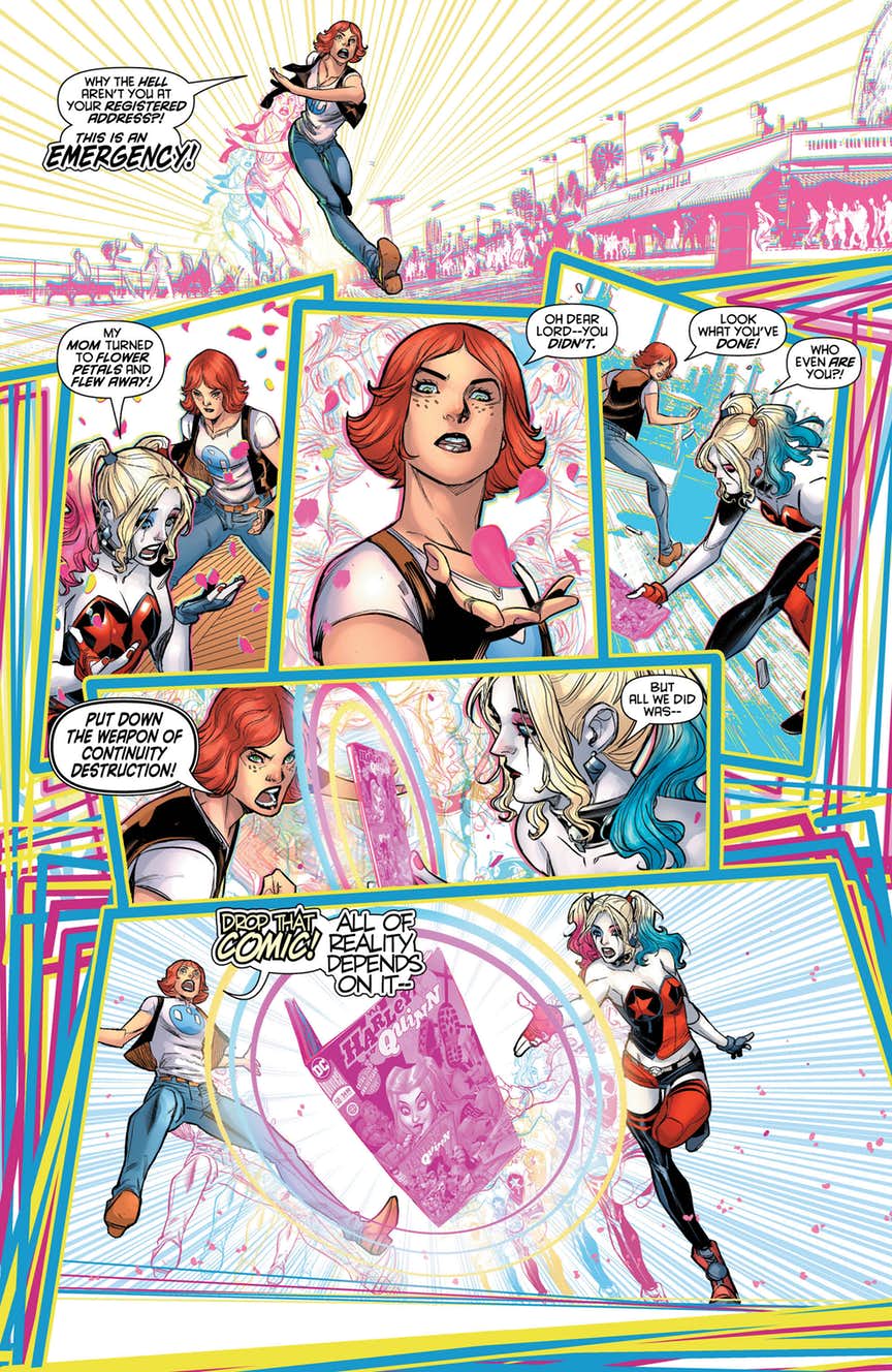 In a special anniversary story, “Harley Saves the Universe!”-no kidding! While reading a mysterious Harley Quinn comic book, H.Q. accidentally breaks all of reality. And you know the saying: if you break it, you bought it! Now it’s up to Harley to travel through both time and space to fix all the continuity errors she created. Luckily, she’ll have a little help, ‘cuz riding shotgun is none other than special guest star Jonni DC, Continuity Cop! Good thing, too, because if Harley fails, it means her own mom will be lost forever. Gulp! That doesn’t sound very funny!