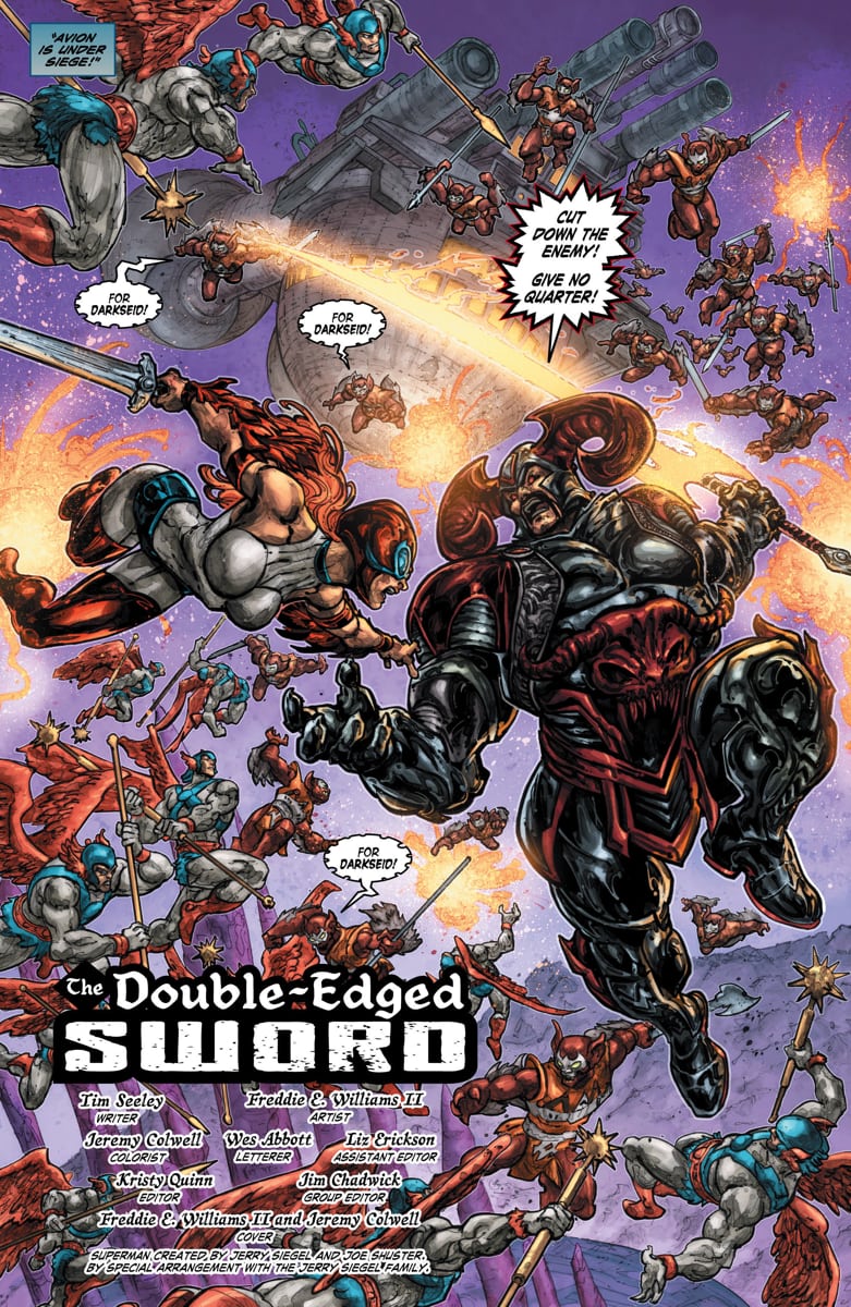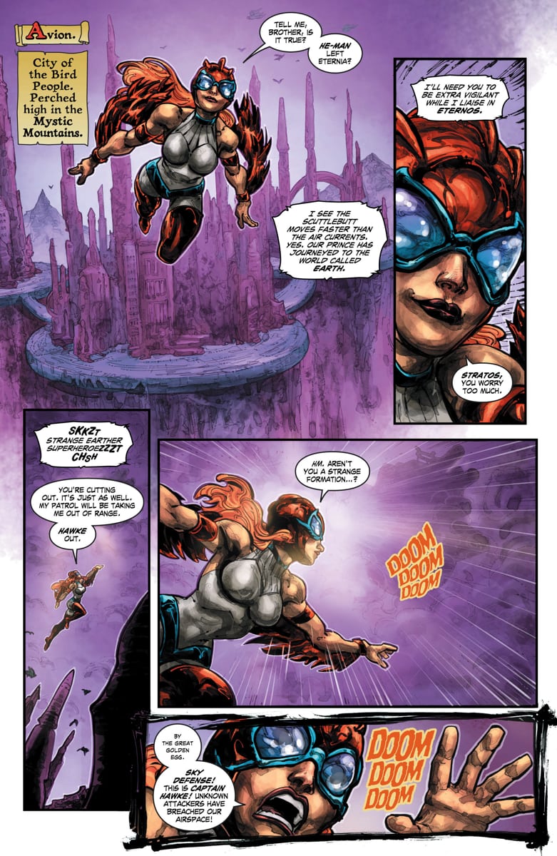 He-Man has come to his mother’s home-world to save it from a despotic ruler: Superman! As Batman plans an invasion of the Oracle to stop their suicide squads from terrorizing the populace, He-Man wanders an Earth city (in disguise) hoping to understand more of the difficulty they’ll face. Meanwhile, back on Eternia, Zatanna and Swamp Thing are horrified to discover that someone else from their universe has crossed over!