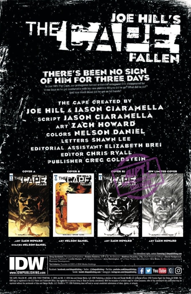Joe Hill’s The Cape Fallen #1 is out on July 4th, priced $3.99.