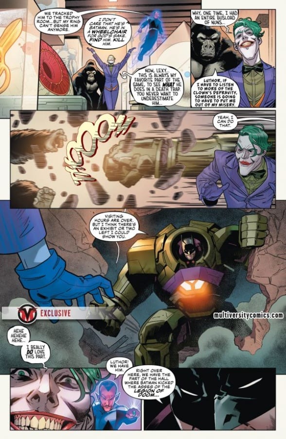 “DROWNED EARTH” part three! It’s Batman, in a full-body cast, versus the Legion of Doom! Get a ringside seat for the craziest fight in comics as a bedridden Batman battles The Joker, Lex Luthor, Gorilla Grodd and Sinestro! Meanwhile, Aquaman locks tridents with Poseidon and Mera discovers an ancient secret that could change the fate of Atlantis—and the entire Earth—forever!