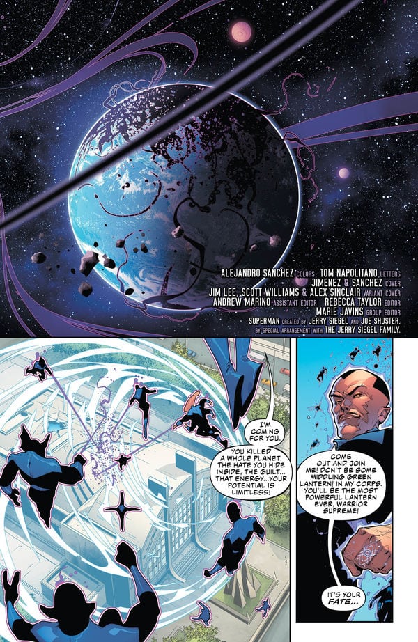 “Did you read the write-up on issue #5? Do you really think anything’s gotten better for the Justice League in the past two weeks? Still Force? Still a thing! Ultraviolet Galaxy Lantern? Keeps attacking! Sinestro? Total garbage! Lex Luthor and Joker? Beating everyone to the Source Wall piece. If that happens? You don’t wanna know.”