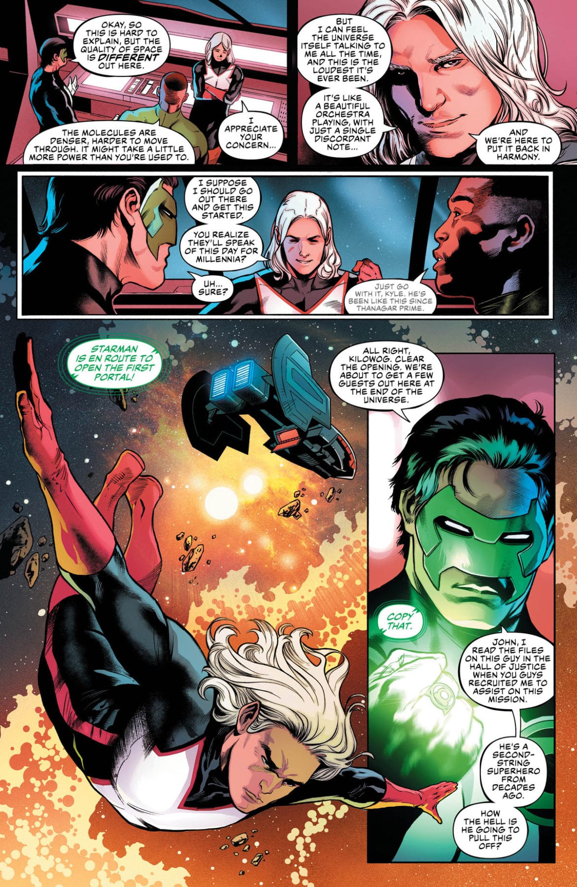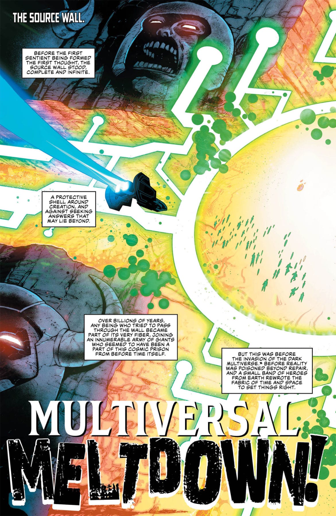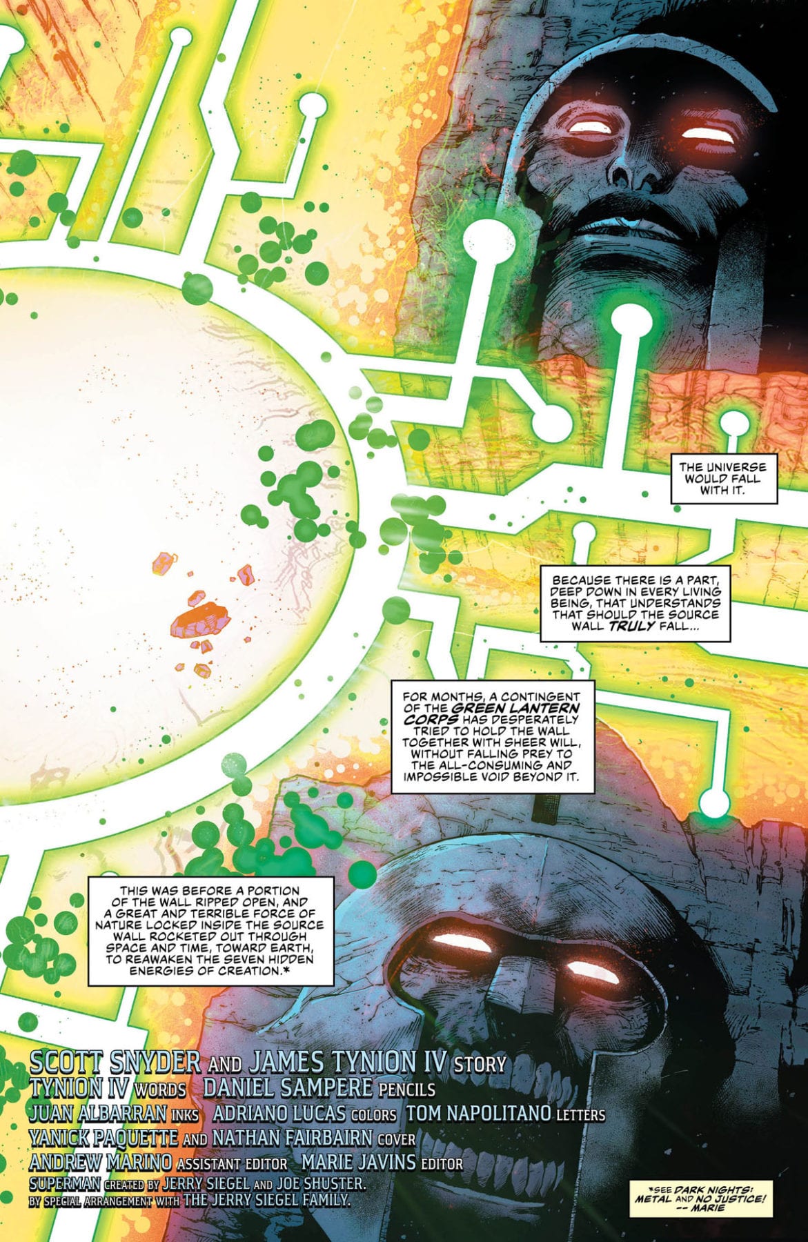 “The Source Wall has degraded too much, and the League must patch the hole right now or the whole Multiverse will collapse! Our heroes scramble for a solution and turn to the only thing that might work: the Omega Titans! The only problem? They killed the Entropy Titan back in JUSTICE LEAGUE: NO JUSTICE. Whoops…but never fear! Kyle Rayner, Miss Martian and Steel—from the non-planet-eating Titans team—guest-star with a plan to create a new Entropy Titan…one that’s so crazy it just might work.”
