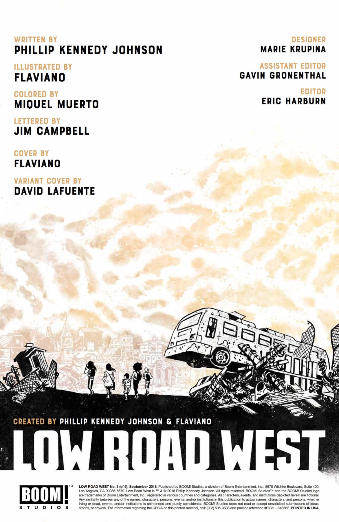 Eisner Award-nominated writer Phillip Kennedy Johnson (The Power of the Dark Crystal, Aquaman) and artist Flaviano (America, Grayson) launch their new limited series Low Road West this coming Wednesday, and thanks to Boom! Studios we’ve got a preview of the first issue for you here; take a look…