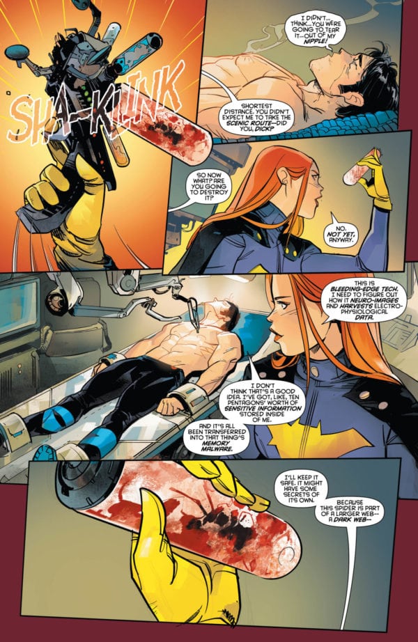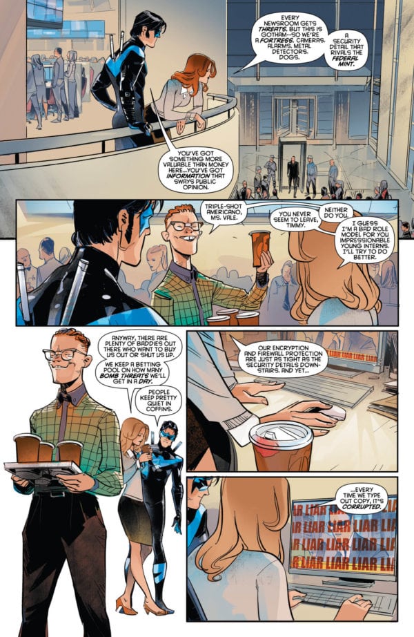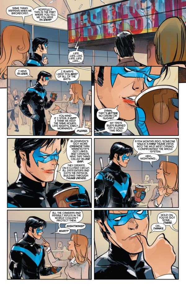 The smart city overhaul of Blüdhaven was just the beginning—a single battle in a larger cyberwar that Nightwing is only starting to understand. But now the story of the Dark Web organization begins to expand as Grayson travels to Gotham City and partners up with Vicki Vale. We live in an era of fake news, alternative facts, disinformation. The gatekeepers of truth can’t be trusted anymore, and sometimes elections, businesses and even lives are at stake. Nightwing faces off against the first of three lieutenants in the army of the Dark Web: Vire, the psychic embodiment of malware who can unearth your darkest secrets.