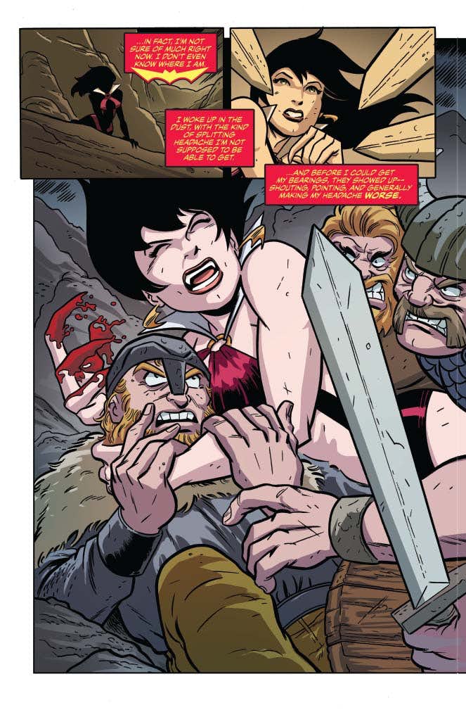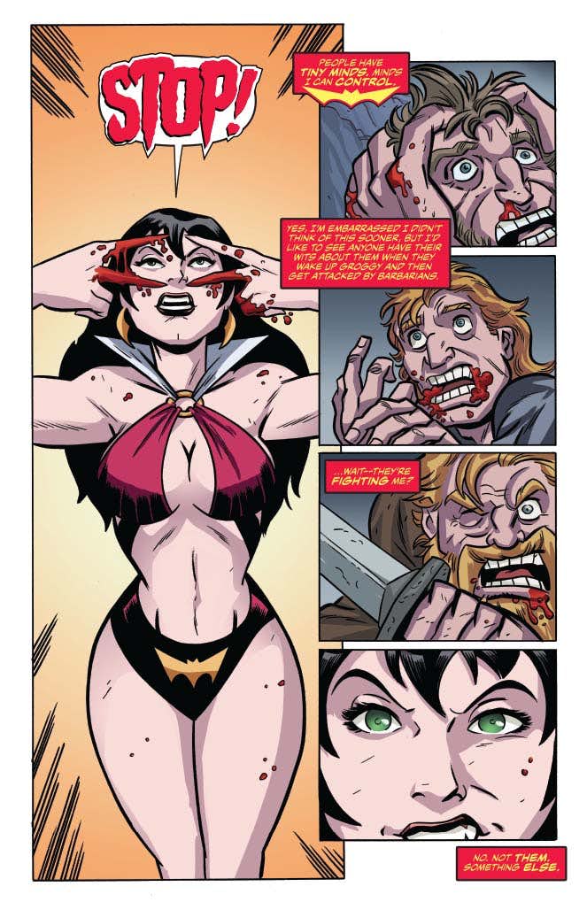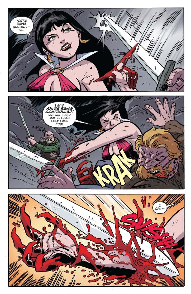 A dead city in the middle of a world filled with violent barbarians is the last place Vampirella would expect to find herself, but here she is — and there’s no time for introspection, because someone is out for her blood! She may be lost in a kill-or-be-killed world filled with swords and sorcery, but she still knows how to hold her own… and when she finds out who has it in for her, she’s going to prove it.